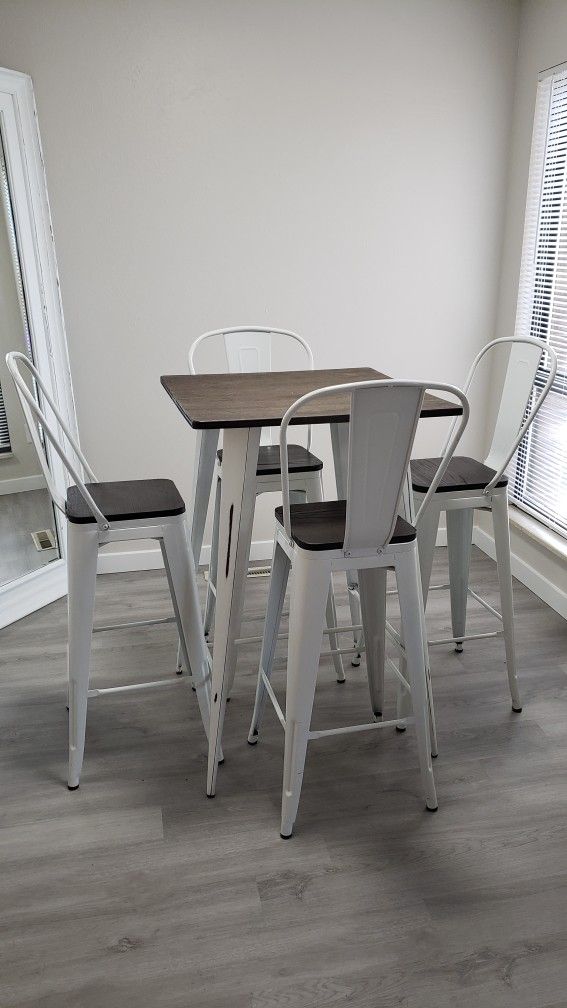 Counter-height dining table with 4 metal chairs. Modern farmhouse / industrial style. Great condition. Smoke-free home. Pickup only.