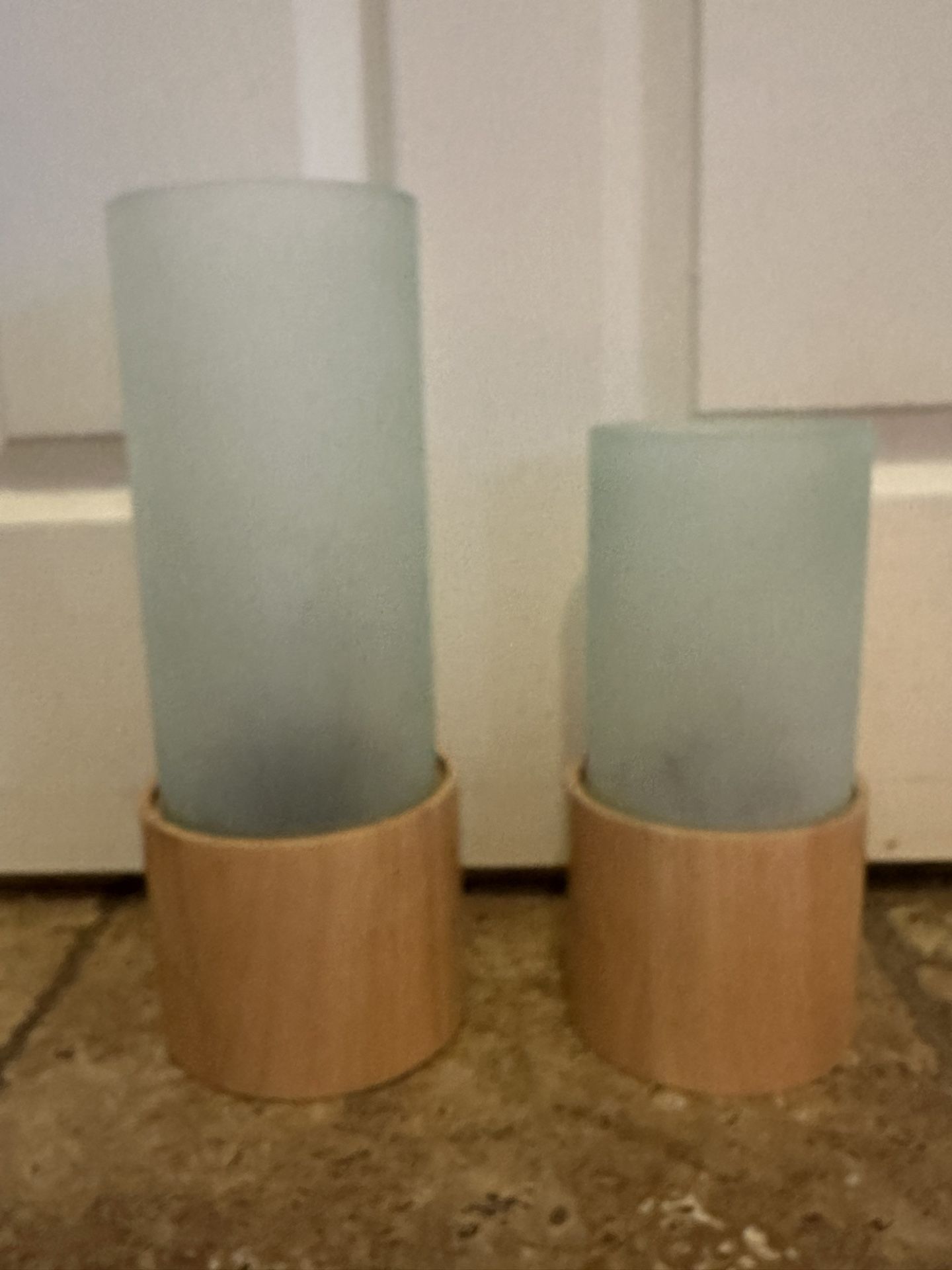 Selling a set of two Glass Hurricane Candle Holders With Wooden Base. Dimensions are: large one is 14” tall x 5” round. Smaller one is: 10” tall x 4.5” round. Both come with a lighted candle. Asking $15 for both. Located in N. Scottsdale. Crossroads are Pinnacle Peak and Hayden.
