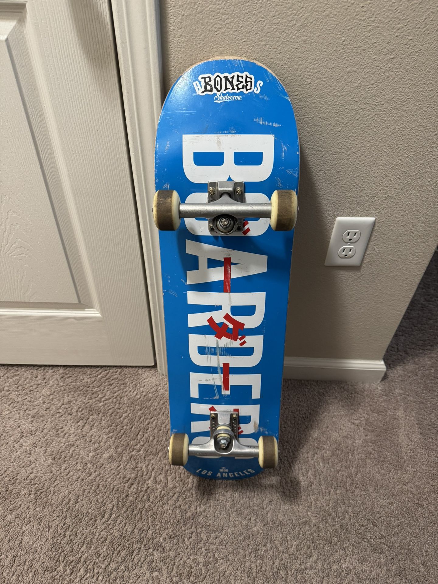 Selling what I think is a 8.5 ” Boarders complete skateboard in near-new condition. Blue and white deck with normal grip tape, barely used — everything is fresh: • Bones wheels • New bearings • Clean trucks • Minimal wear, smooth ride Open to offers but semi firm on price. DM if you’re interested or want more pics. SLIGHTY USED