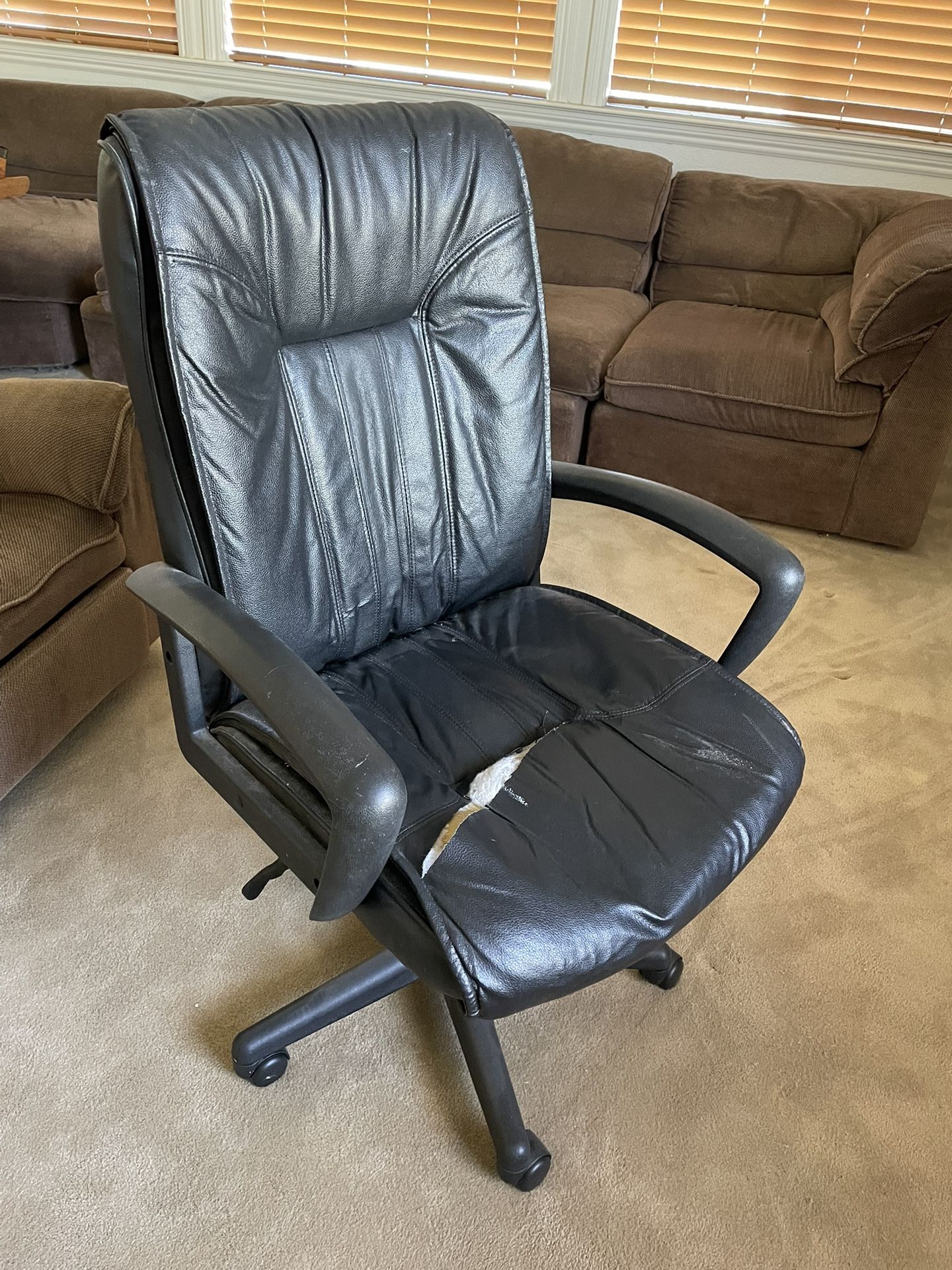 Pleather swivel reclining computer desk chair. Has an approximately 8 inch cut that can be easily covered by a pillow.