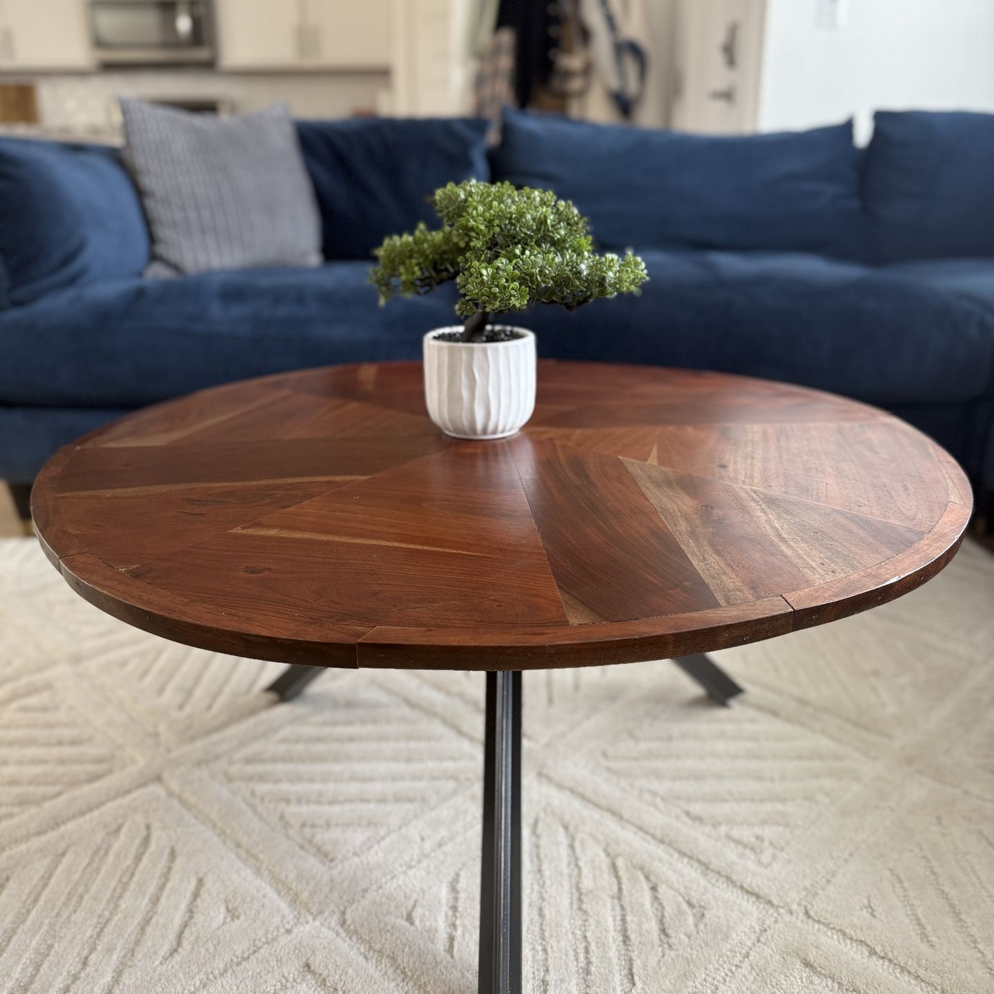 Beautiful solid wood round coffee table with unique geometric top design and modern black metal legs. Great size for a living room or apartment. In good used condition – some light surface wear consistent with normal use, but still very sturdy and looks great. Perfect for modern, mid-century, or rustic style spaces. Pickup in Austin 78717. Delivery available.