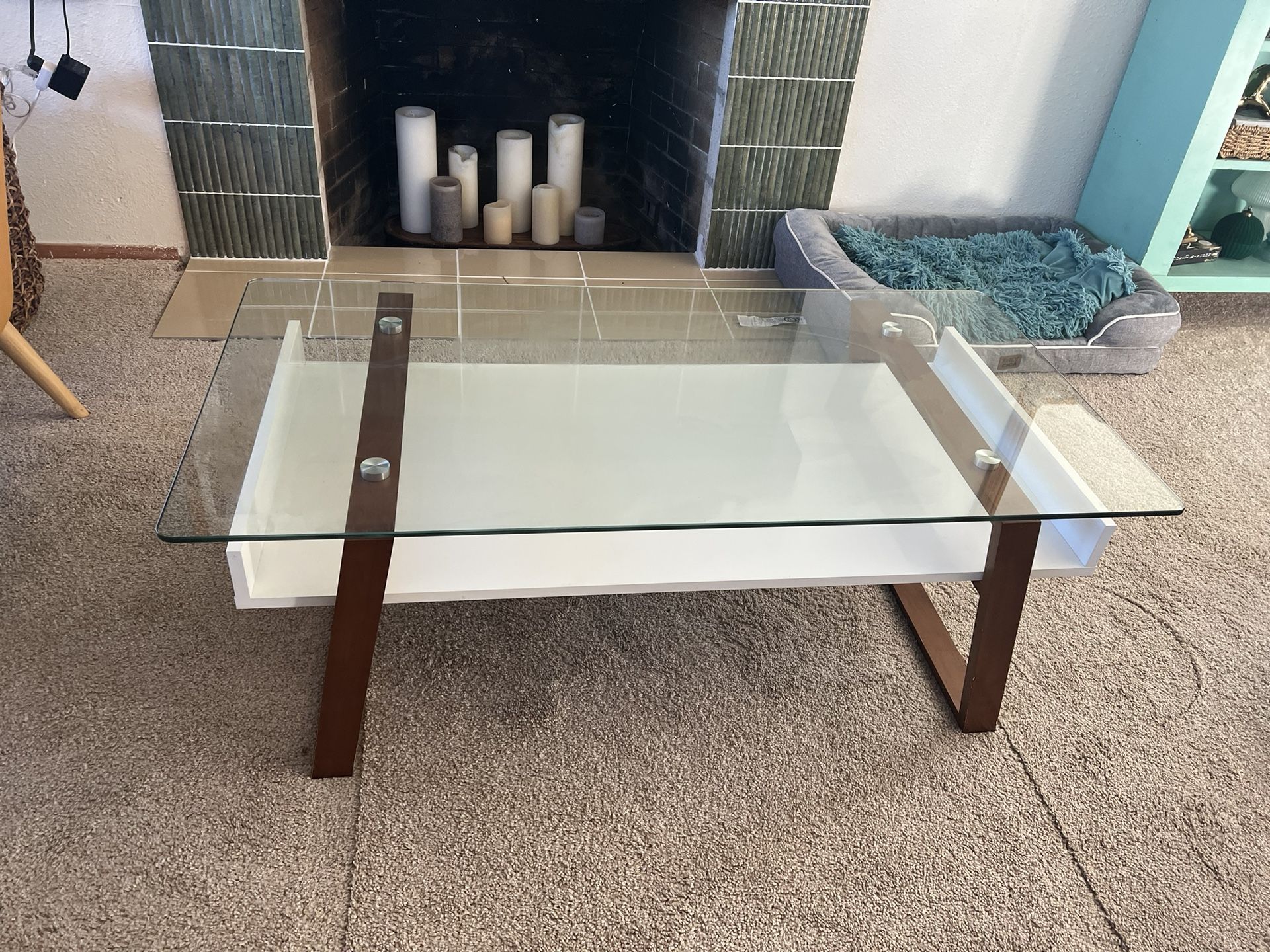 Mid century modern glass and wood coffee table. White shelf offer storage. Rounded glass corner for safety.