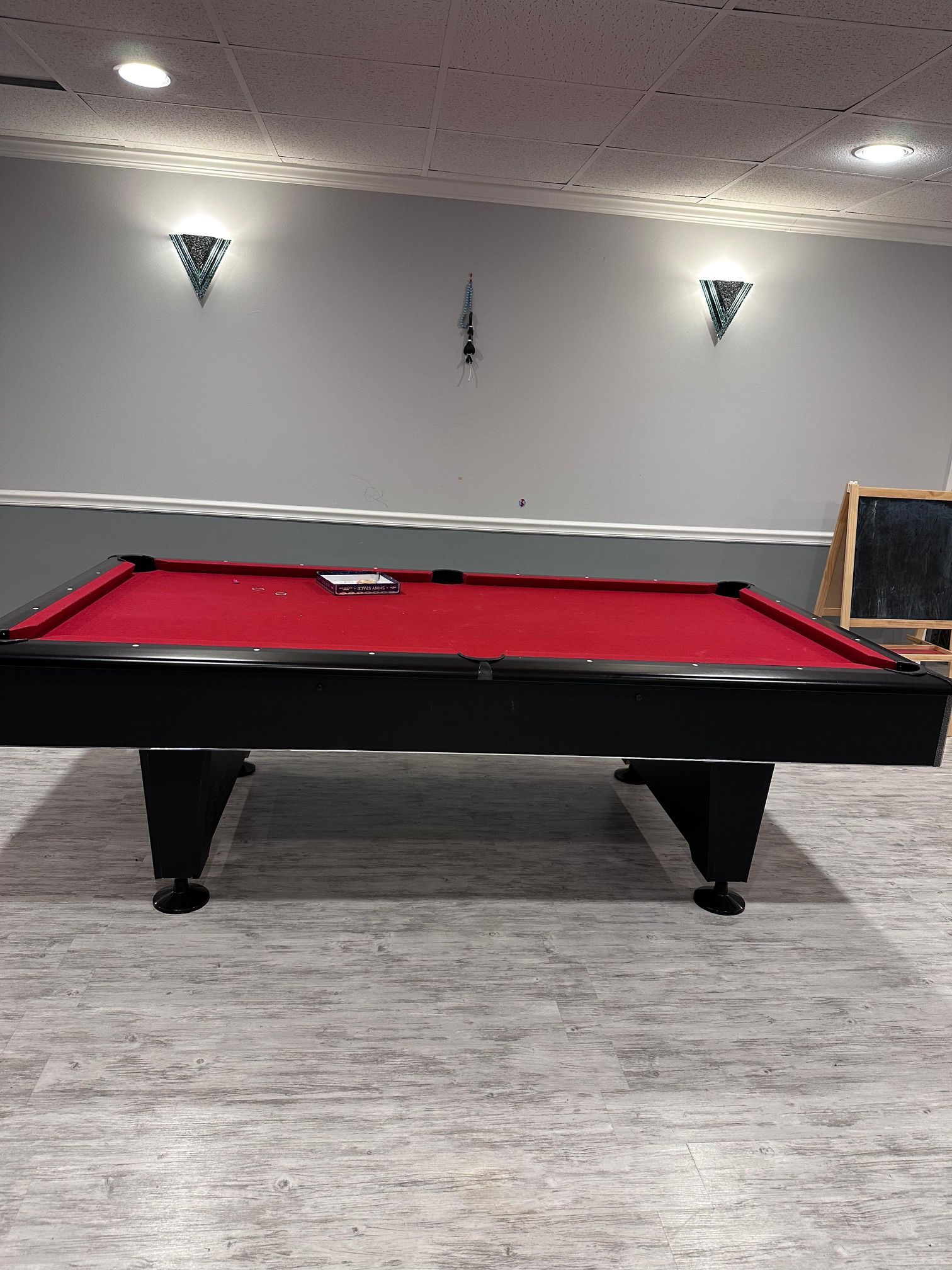 Selling a high-quality Kasson pool table in great condition. ✅ Striking red felt – makes your game room pop ✅ Solid and sturdy build – built to last ✅ Sleek black frame with modern design ✅ All pockets in great shape