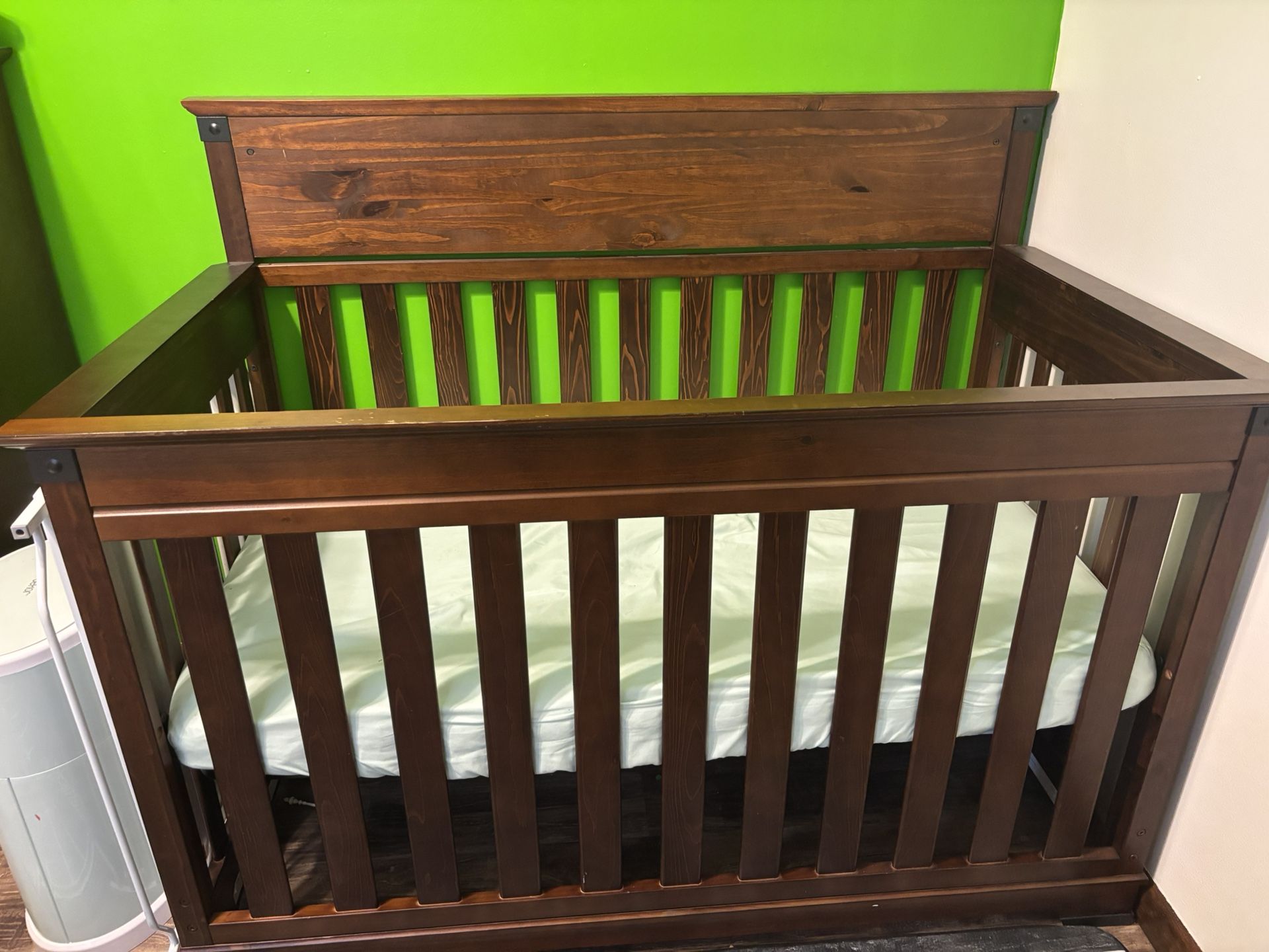 Infant crib that can transform into toddler bed after more pieces are bought with mattress , changing table complete with mattress, dresser dog, friendly home no smoking crib only used three times
