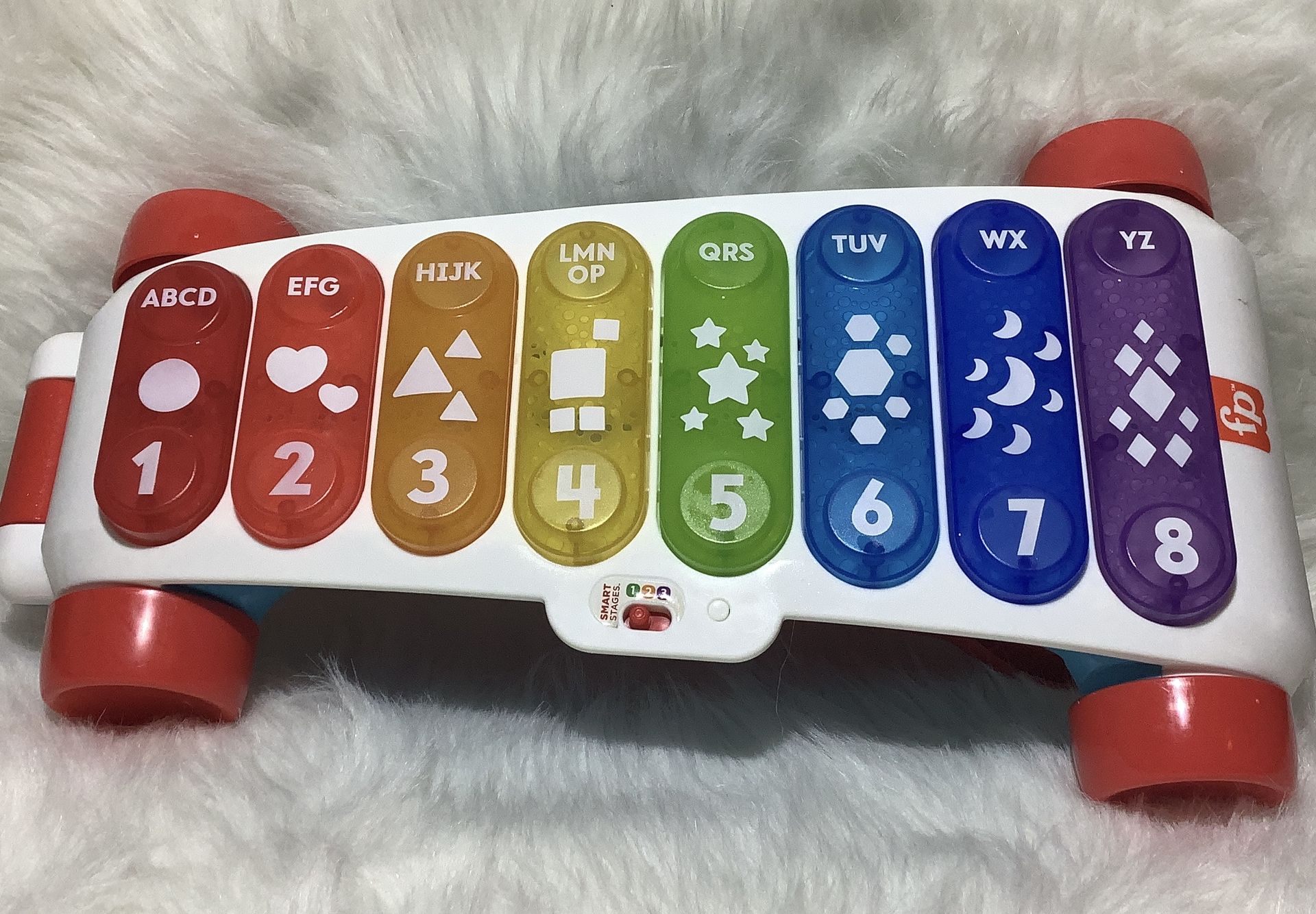 It has eight multi-color light up buttons that activates over 60 songs, sounds and phrases. It also has three learning levels.