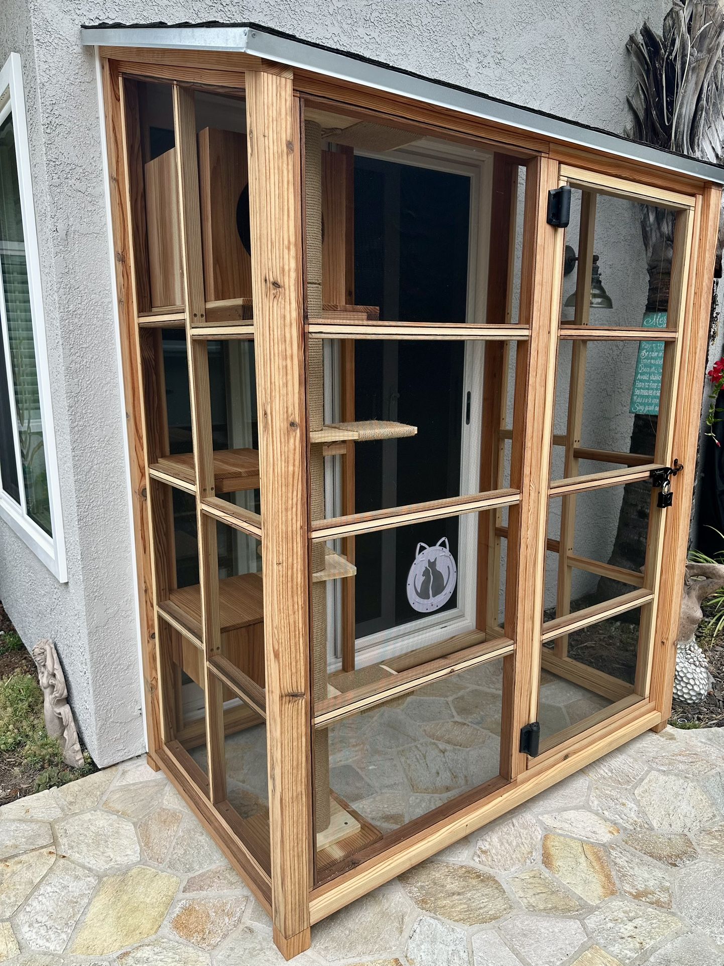 NEW Beautiful High End Quality Custom Catio! This structure is meticulously & professionally constructed (by my skilled carpenter husband) & built to last with safety & security in mind, made from protectively sealed solid cedar wood & stainless steel screen. It has asphalt shingle roofing to keep it weather proof & also includes multiple shelves & features some practical & fun accessory pieces on the interior. This piece provides the perfect opportunity to allow your kitties that coveted outdoor time, while remaining comfortably safe from predators - it is sure to keep them entertained & content for hours! Feel free to message for more details or with any questions - other styles & material choices also available - more than happy to customize a special one for you & your beloved pet(s)!!