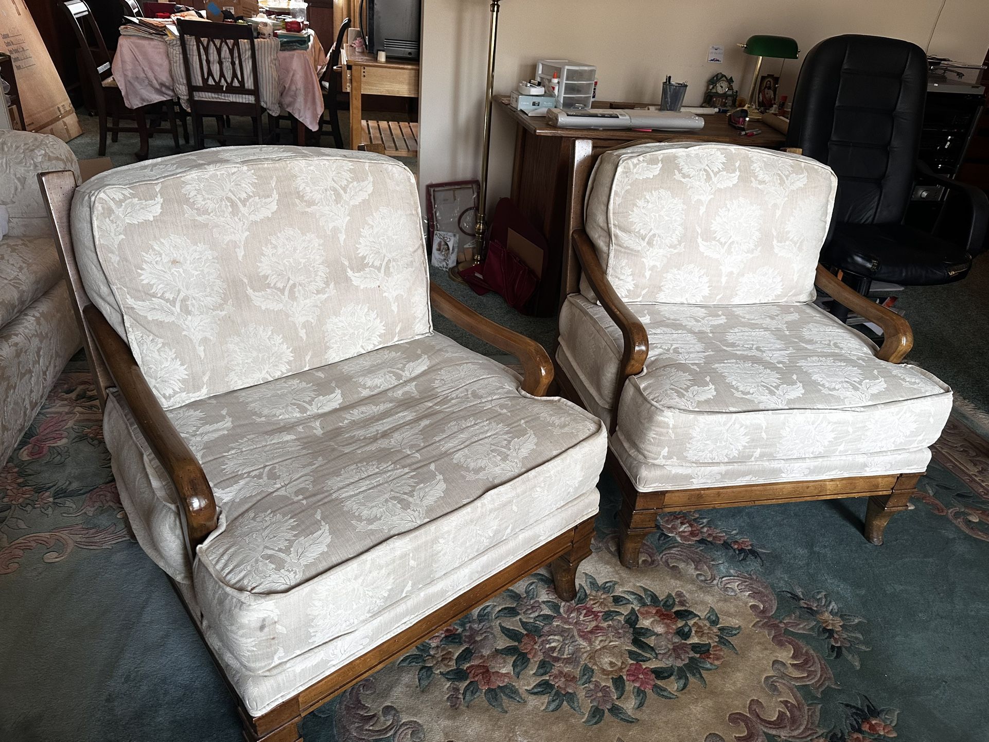 These are living room sitting chairs. Heavy, real wood, white cushions. There are a couple small stains on the under side of one of the chair cushions.