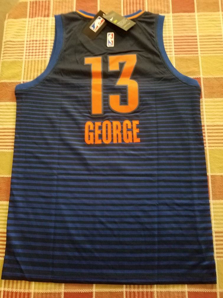 I have a brand new with tags never worn Paul George Oklahoma City Thunder basketball jersey. This jersey is available in sizes medium large and XL. Limited Supply. Get yours today and watch the Oklahoma City Thunder play the San Antonio Spurs at 7:30 tonight on ABC!