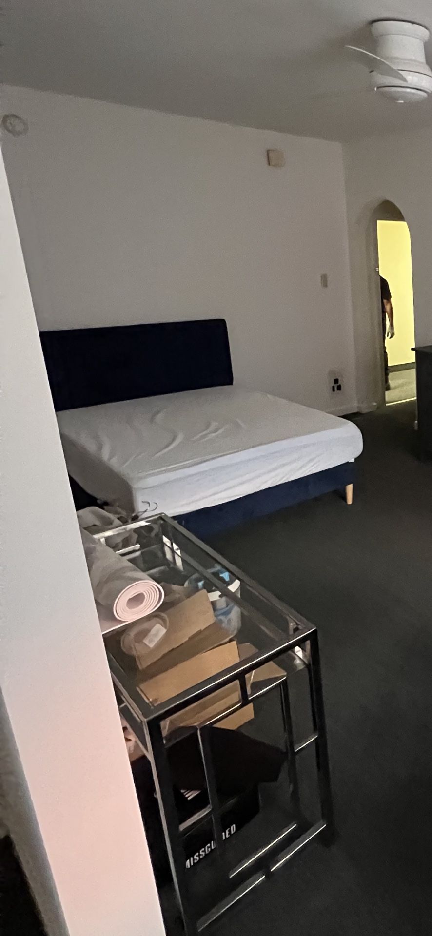 Been used for a little less than 2 years. Mattress is ZINUS 10 Inch Green Tea Cooling Gel Memory Foam Mattress that has been in a mattress protector since day 1. The bed frame is Velvet Upholstered Platform Beds Full with Strong Wooden Slats. The headboard is navy blue but not as bright as depicted in the screenshot. The building has a small elevator or 3 “flights” of stairs (about 5 stairs each flight). NEEDS TO BE PICKED UP BY 2pm TODAY PRICE NEGOTIABLE