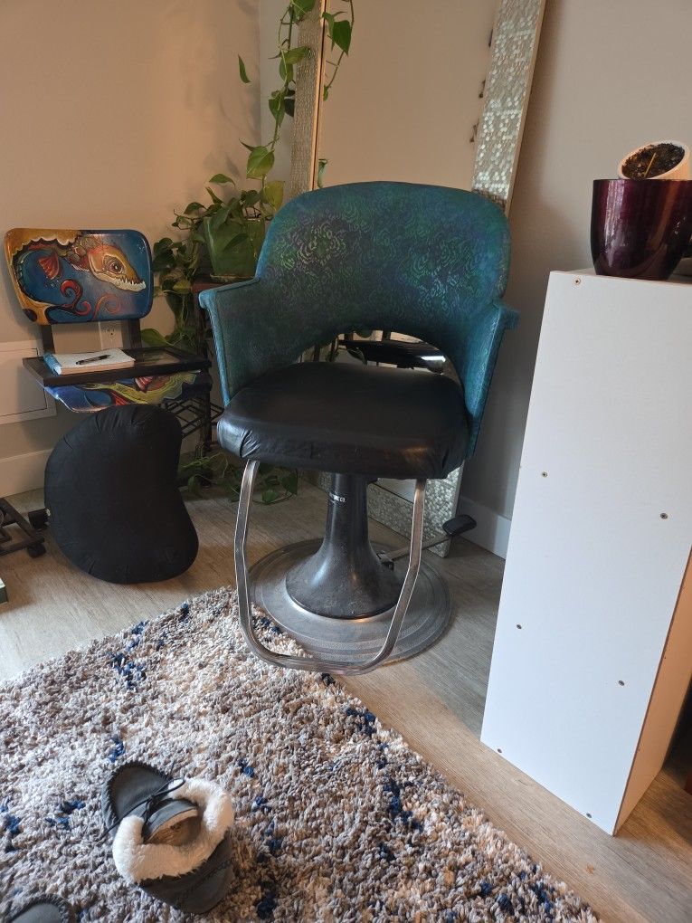 Antique hair styling hydrolic chair. There's a small amount of fabric that has pulled away on the corner, it's nothing that can't be fixed easily. Asking $25 obo It's a perfect vintage piece for any beautician ✨️