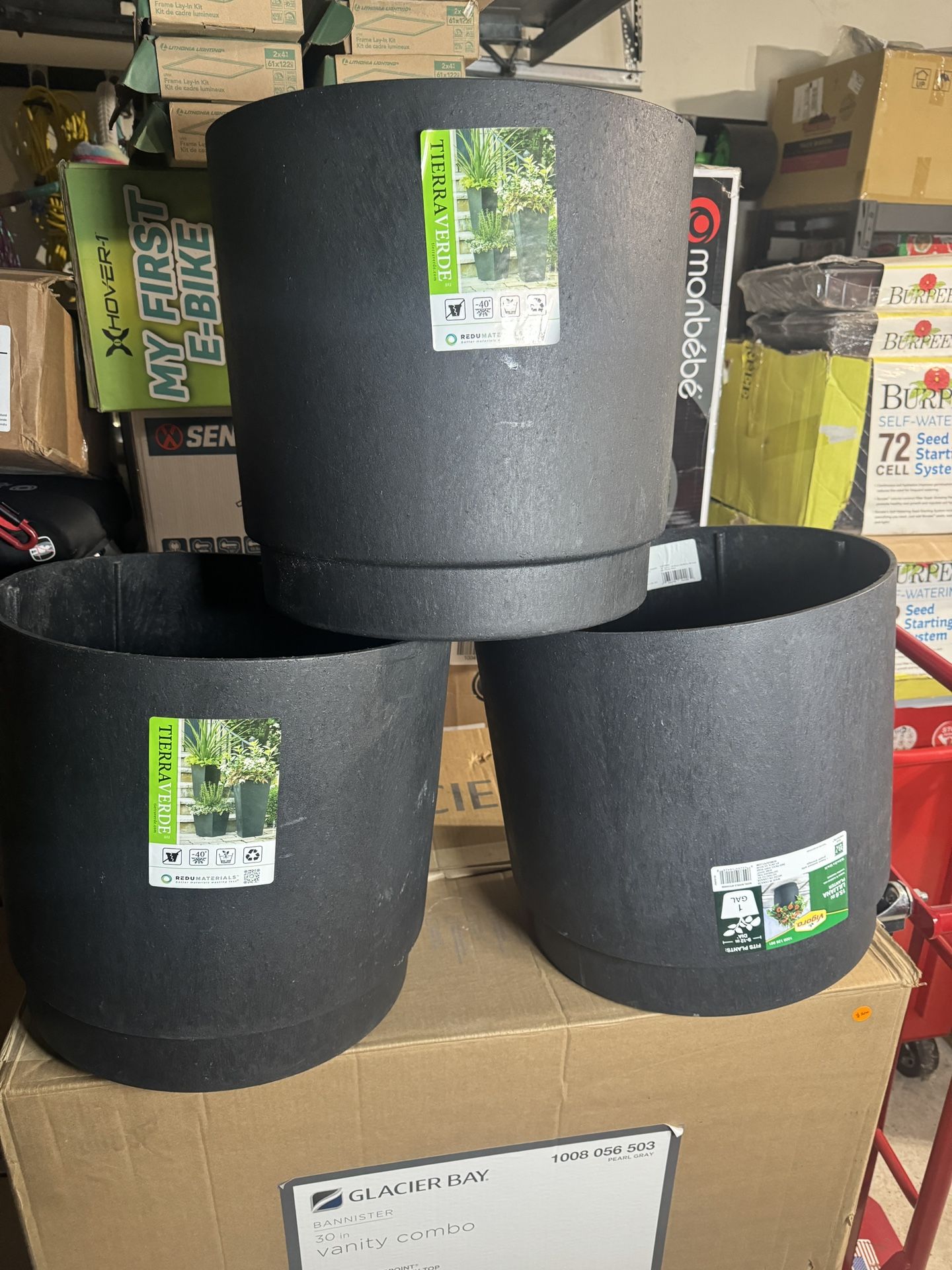 Brand new Never used Vigoro Lillian Medium Black Recycled Materials Round Planter with Drainage Holes (15.6 in. L x 15.6 in. W x 15 in. H) Asking $25 each I have 3 left