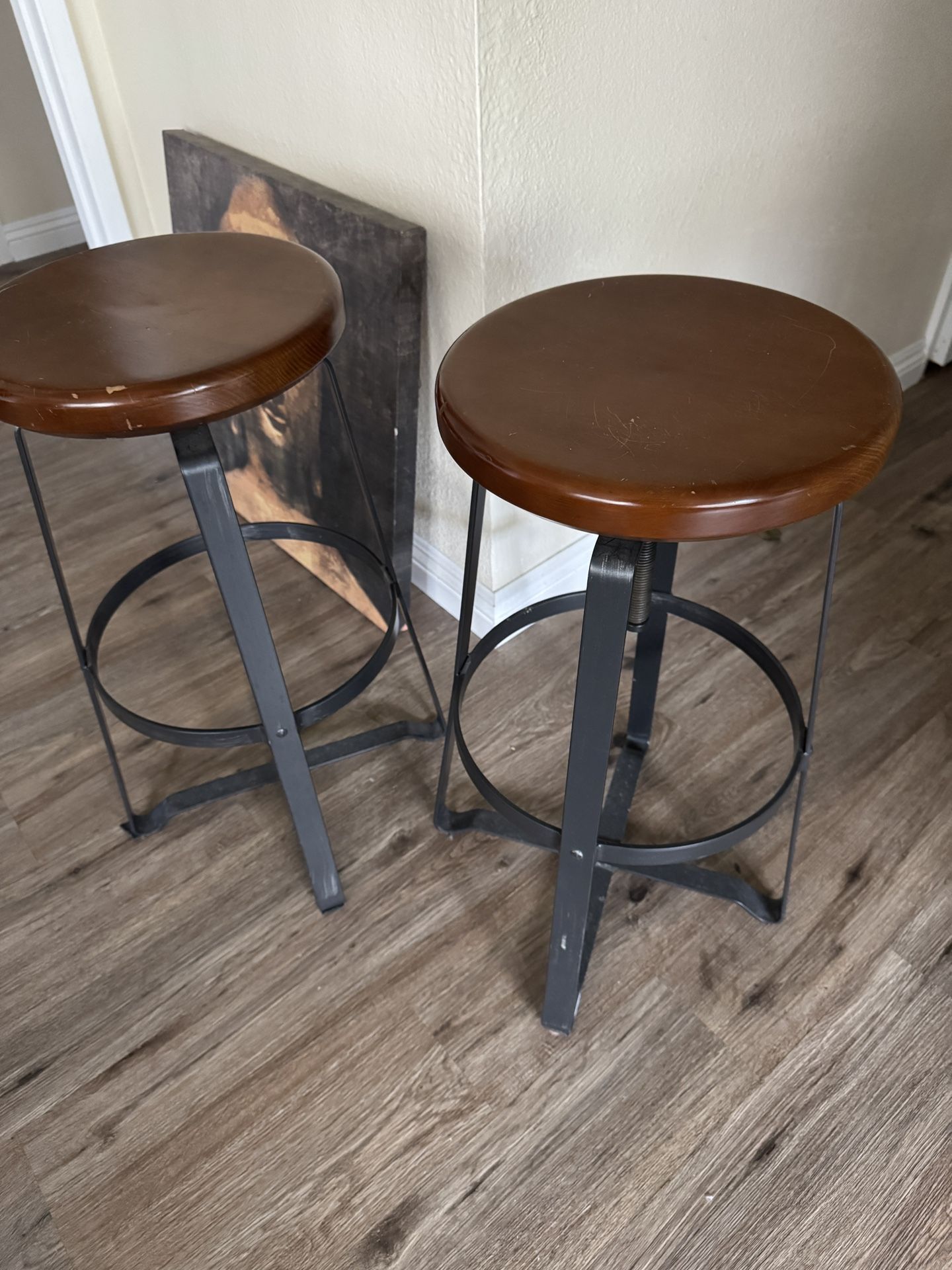 Heavy metal bar stools. Wood and steel. They spin up to different levels because the seat is on a screw. I’m basically giving these away just come get them. Pick up in Lajolla.