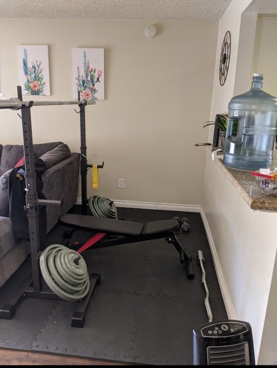 Selling barbell, EZ bar, bench, rack, and weights. No rust. All in good condition. (2)1/2lbs (2)5lbs (2)10lbs (2)25lbs (2)35lbs (2)45lbs