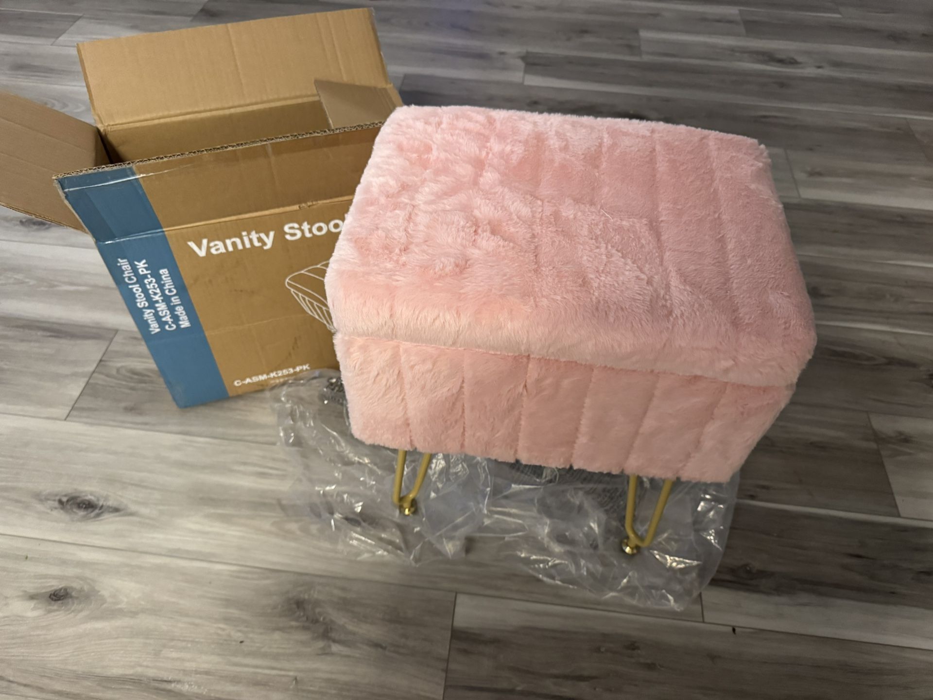 Vanity Stool Chair Faux Fur with Storage, Soft Ottoman 4 Metal Legs with Anti-Slip Feet, Furry Padded Seat, Modern Multifunctional Chairs for Makeup, Bedroom Pink New $30