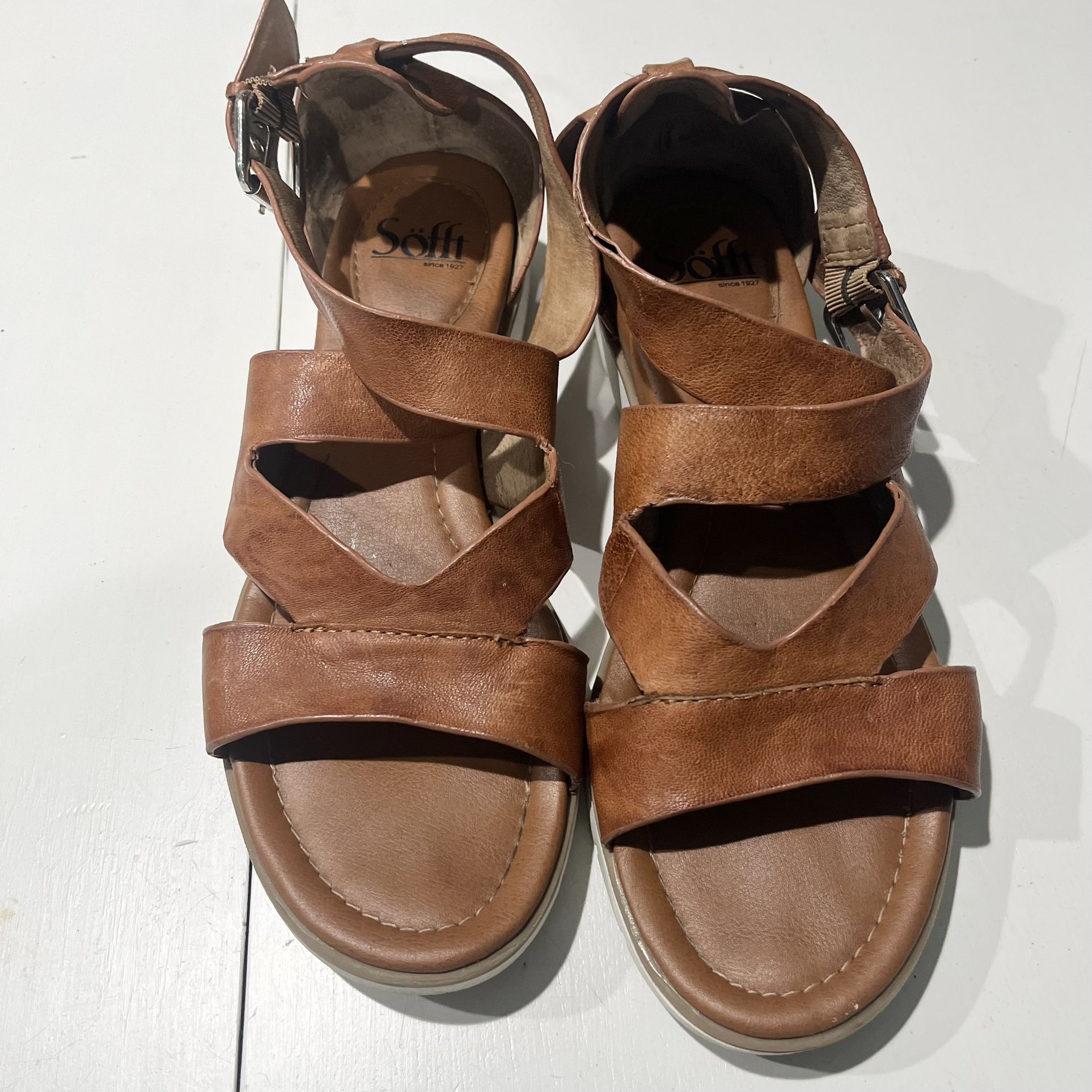 Sofft ankle leather strap vara sandals flat side buckle womens size 10 brown tan