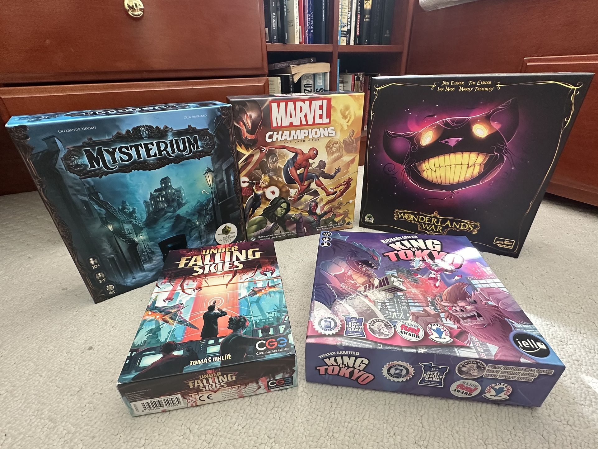 Used board games for sale that we just don’t have time to play. All are in good condition. I can send over more pics upon request. (Prices lowered!!) - Wonderland’s war (retail edition) - $70 - Marvel champions (opened, components still in shrink) - $20 -Mysterium - $10 - Under Falling Skies - $10 Free w/ purchase (everything in 2nd picture) -Carcasonne (missing pieces) -Santorini (missing pieces) -DnD starter set (missing pieces)