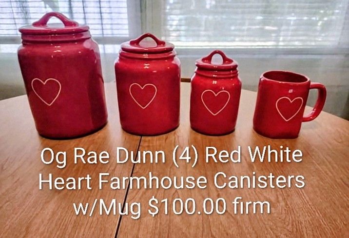 Og Rae Dunn New Ceramics Red/White Heart 4-Piece Farmhouse Canister Set $80.00