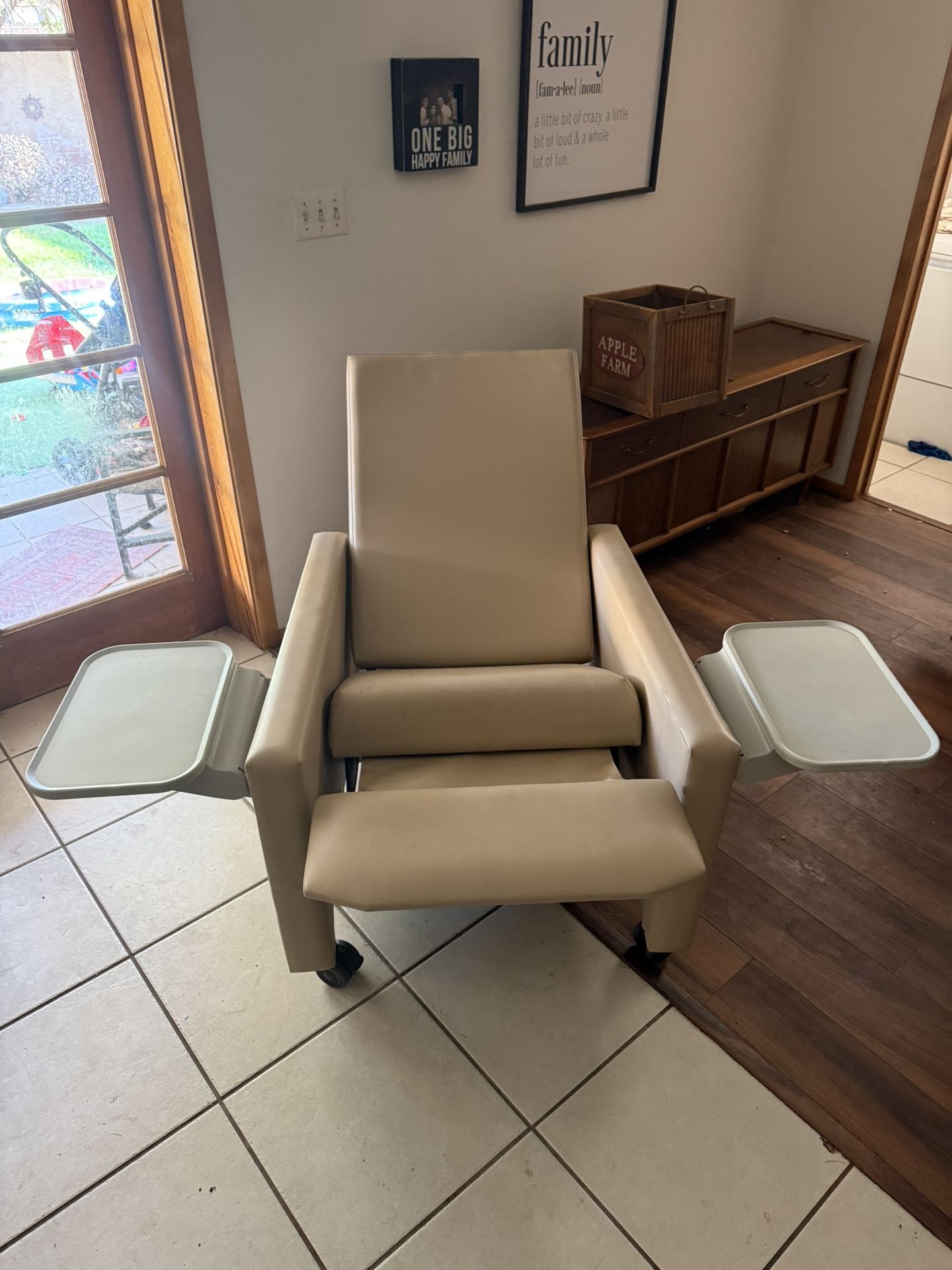 Like-new Champion Manufacturing medical recliner chair, manufactured November 2023. • High back support with padded armrests • Dual swing-away tray tables on each side • Reclining feature for added comfort • Heavy-duty vinyl upholstery (easy to clean) • Smooth-rolling casters for mobility • Meets California flammability standards Perfect for home use, caregiving, nursing, or recovery settings. Durable build and modern neutral beige color fits any space. Condition: Excellent – gently used, no tears or major wear. medical recliner, hospital chair, patient chair, caregiver chair, nursing home furniture, Champion Manufacturing 700 OBO
