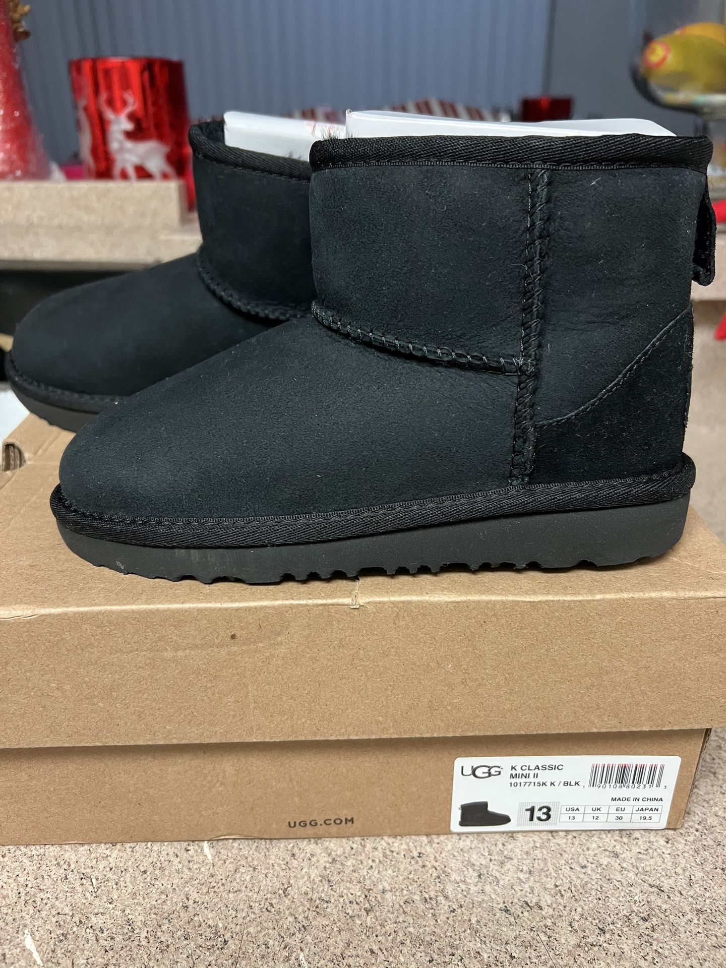 The UGG Classic Mini II in Black is a popular, water-repellent sheepskin boot with a plush wool lining. Kids Size 13. New.