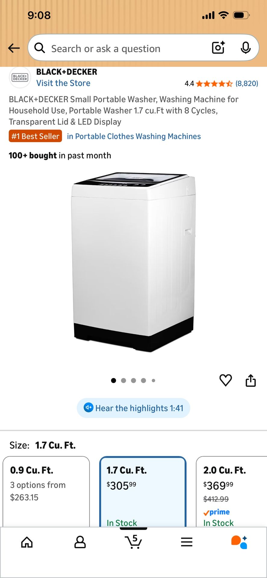 BLACK+DECKER Small Portable Washer, Washing Machine for Household Use, Portable Washer 1.7 cu.Ft with 8 Cycles, Transparent Lid & LED Display