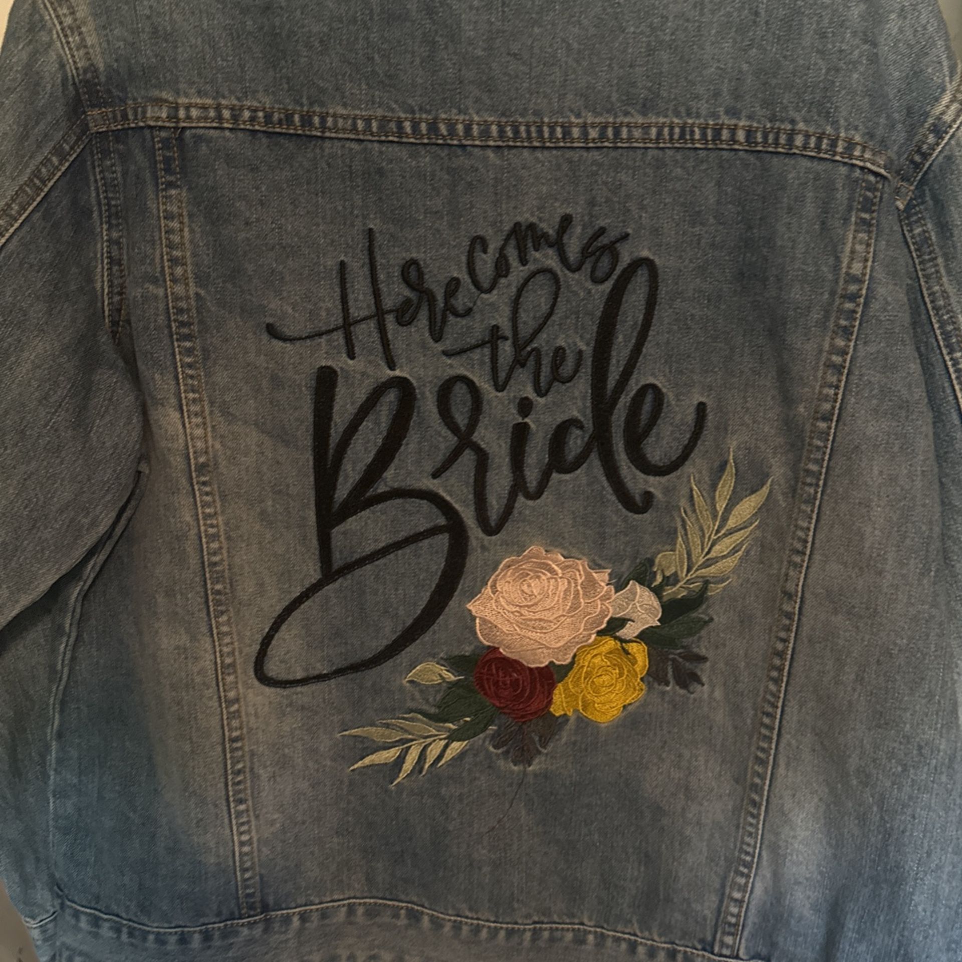 Never worn, still with tags, smoke free home. “Here comes the bride” Jean jacket