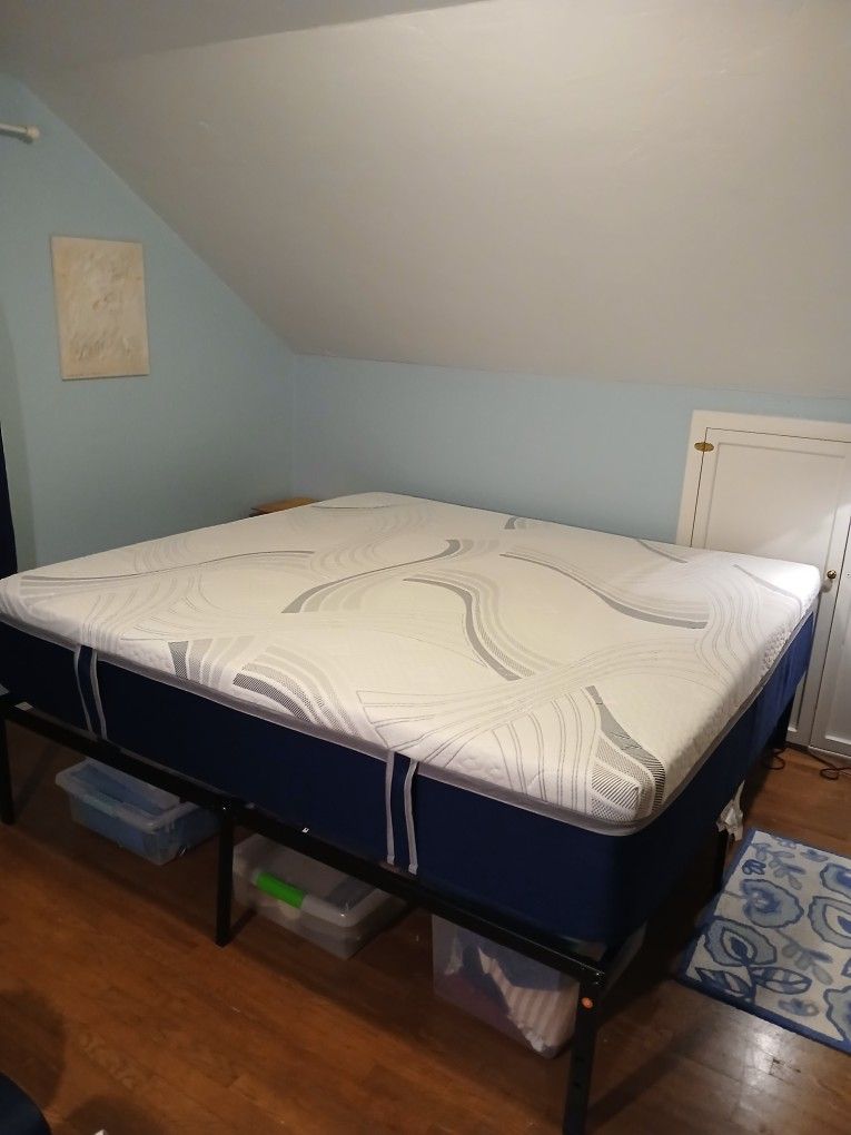 Purchased in May 2025 for $499 at Costco. In excellent condition. Black Metal Frame is from Wayfair. Tall enough to store plastic bins underneath which is so nice! Was $100 new. Will include two sets of sheets, mattress cover and separate protector and dust ruffle. Too big for our bedroom!