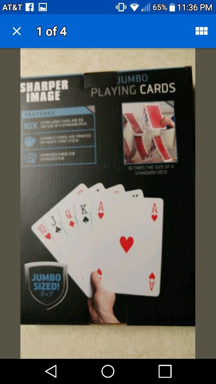 Up for sale is a New Sharper Image 8"x11" Jumbo Playing Cards. 10X The Size of A Standard Deck. Fun Deck Poker Durable printed on heavy card stock. See pictures. Questions message me. Thanks for looking.