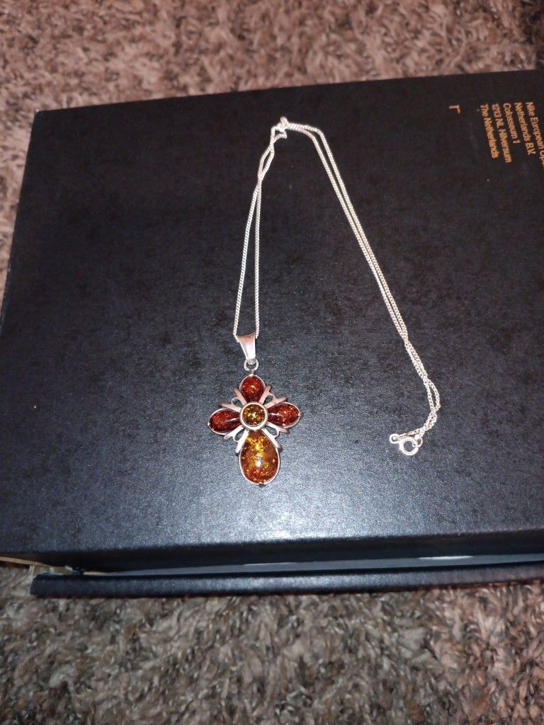 Vintage Amber Sterling Silver Cross. 1 1/4 Weight 4.57 grams. Marks 925 V-8 Poland . Very Good Condition