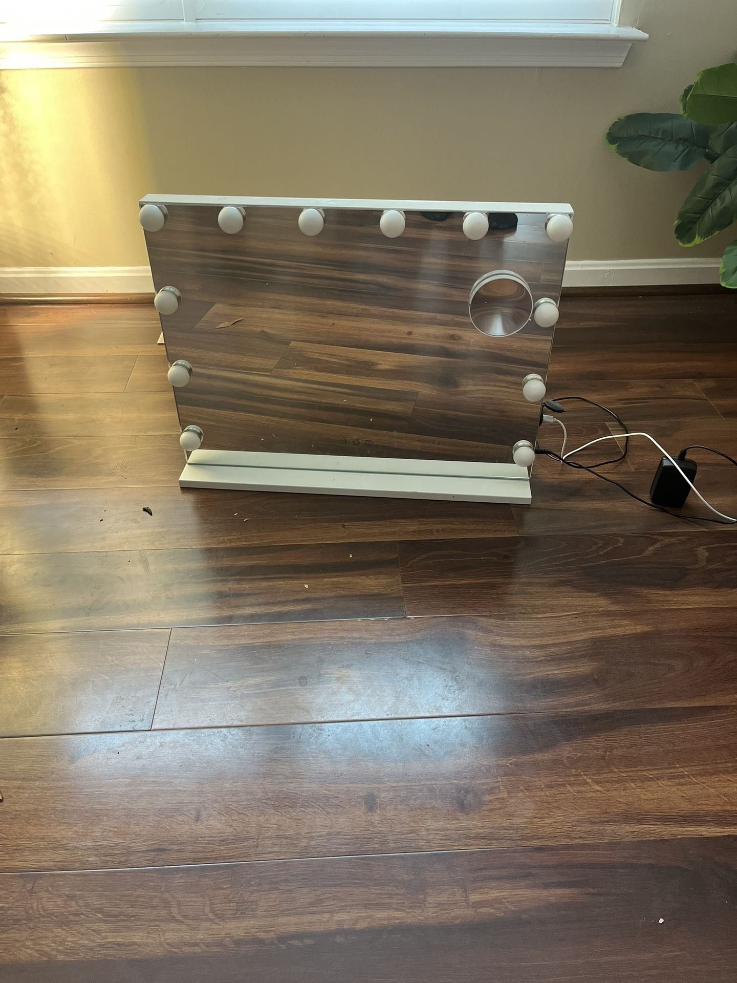 Size is 23x18. Brand is Hollywood Vanity Mirror. Has lights and USB charging port. Everything works. The light settings are warm or cool.