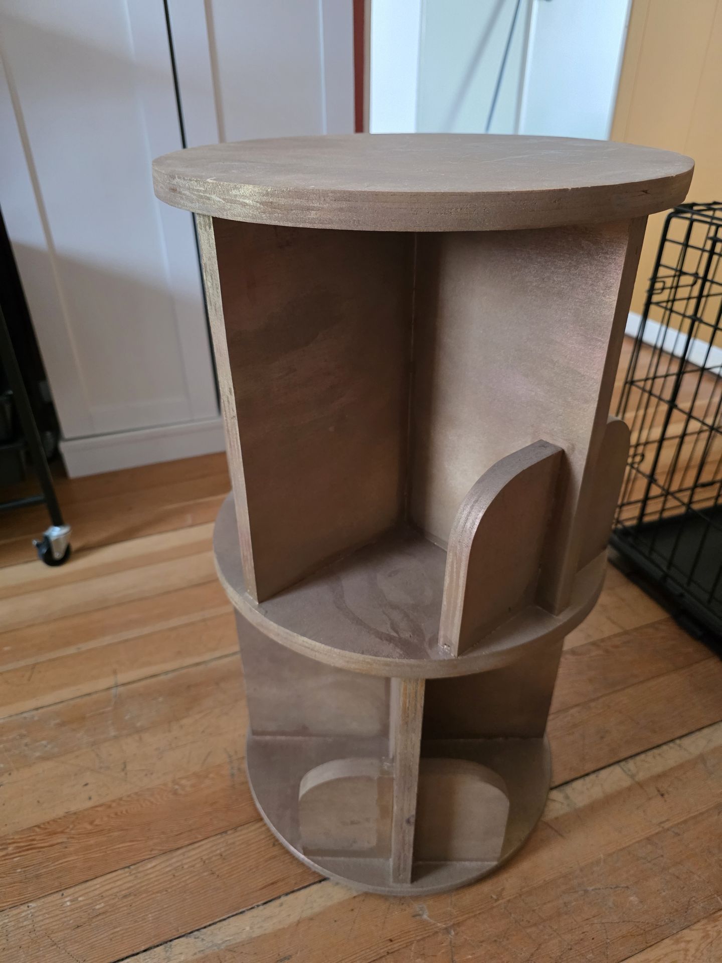 Homemade bookshelf that rotates. Has a nice shelf on top and 8 book sleeves total 4 on top and 4 on bottom!