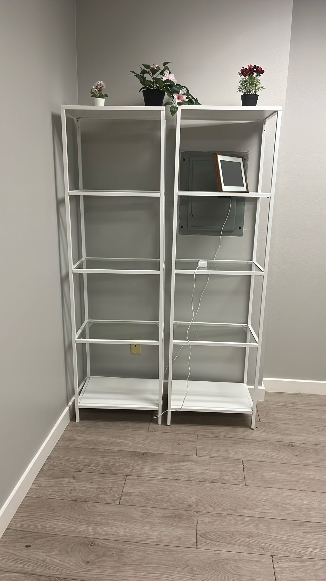 2 Metal And Class Shelves, height 69” width 20.2”, deep 16” , very new condition