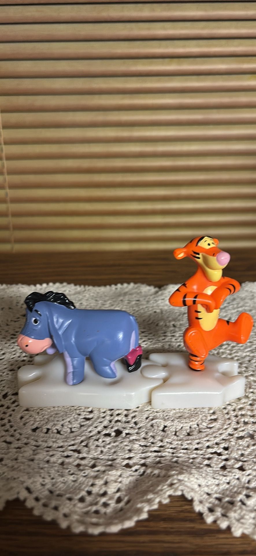 Disney Winnie the Pooh 2 collectible figurines Eeyore and Tigger toys from McDonalds Disney Video Showcase Happy Meal Series 2000 Bases are interlocking pieces like a puzzle Eeyore Base 3” W 2” tall Tigger Base 2.25” W 3” H PVC Material Great condition. See video and photos for the excellent condition Non smoking home Sandy porch pick up Ships