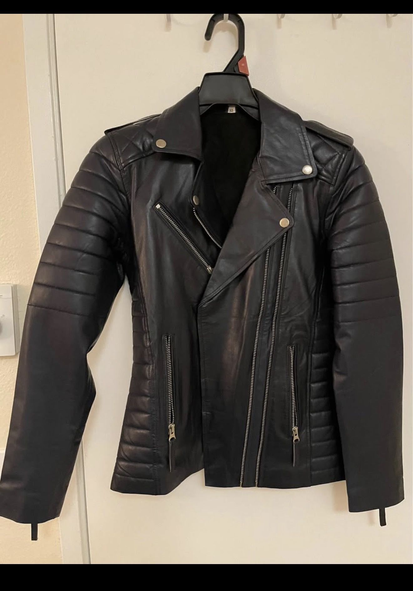 A striking hand-crafted women’s biker jacket in a sleek blue finish, blending edgy style with impeccable craftsmanship. This size small jacket features quilted detailing, multiple zippered pockets, and a classic asymmetrical zipper, exuding bold sophistication. Lightly used but in like-new condition, worn only 2-3 times in the past year, preserving its pristine quality. Crafted from premium leather, it offers both durability and a unique, modern flair. Available for $70 on other Marketplace—grab this standout piece today!