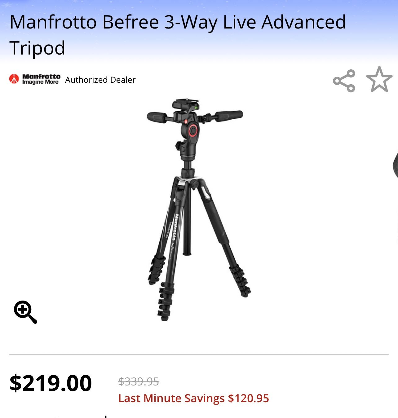 New Value $339.99 Manfrotto Befree 3-Way Live Advanced aluminum travel tripod kit (MKBFRLA4BK-3WUS). Designed for both high-quality photo and 4K video applications with DSLRs and mirrorless cameras. Features a 3-way fluid head with foldable handles for compactness and smooth movement. Maximum height of 151cm (59.449in) and a packed length of 40cm (15.748in). Safety payload capacity of 6.0kg (13.23lbs). The unique 200PL-PRO plate is compatible with both Manfrotto RC2 and Arca-Swiss type head attachments
