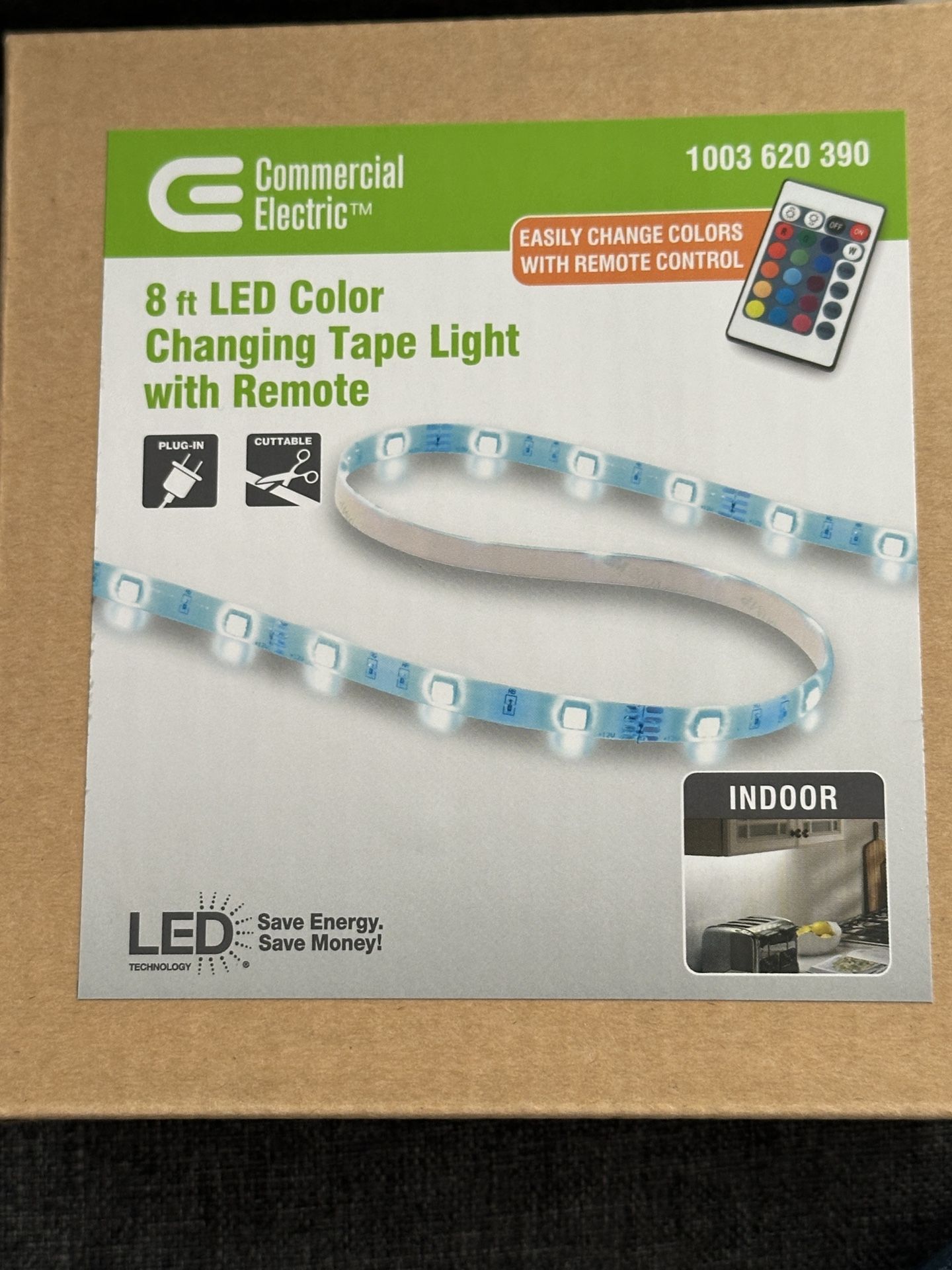 Illuminate your shelves, cabinets, closets, pick a color with the remote. Consumer Electric 8ft LED color changing tape light, with remote. This is brand new in box Any questions please let me know. Thanks for looking!