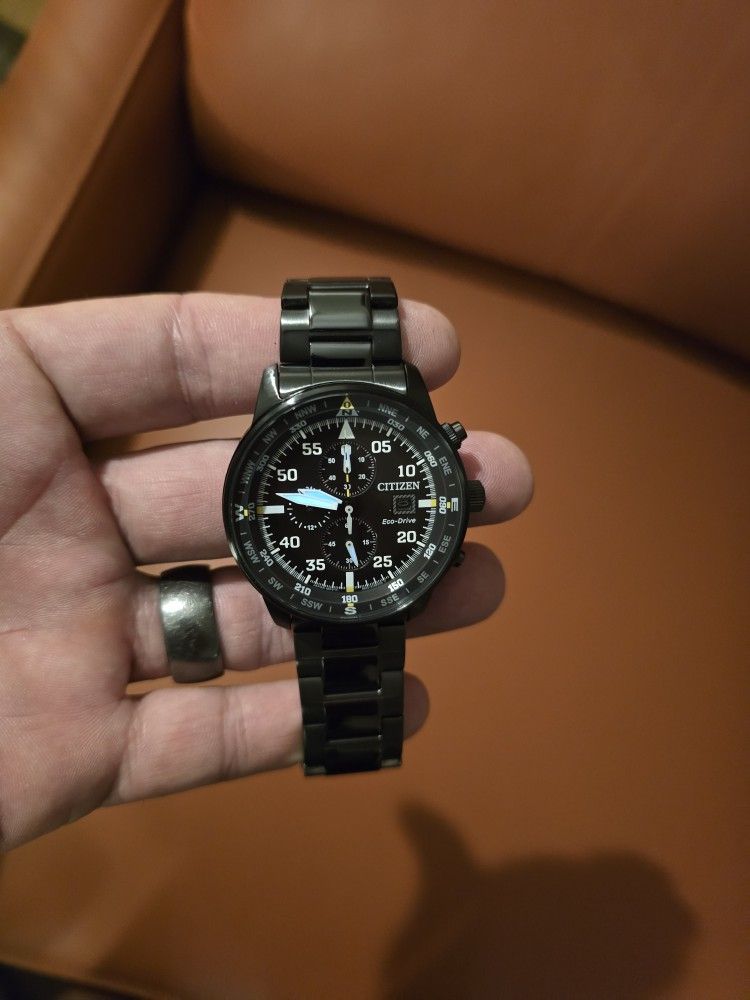 Black dial enhanced by luminous white hands. Black stainless steel case with a black stainless steel band. Eco-Drive movement. 100 meters / 330 feet water resistance. Scratch Resistant Mineral crystal. Solid caseback. Deployment with Push Button Release clasp. Pull / Push crown. Case size 44 mm x 13 mm. Band 22 mm x long. Citizen CA0695-84E Watch. New, no box with all links not worn. Beautiful...