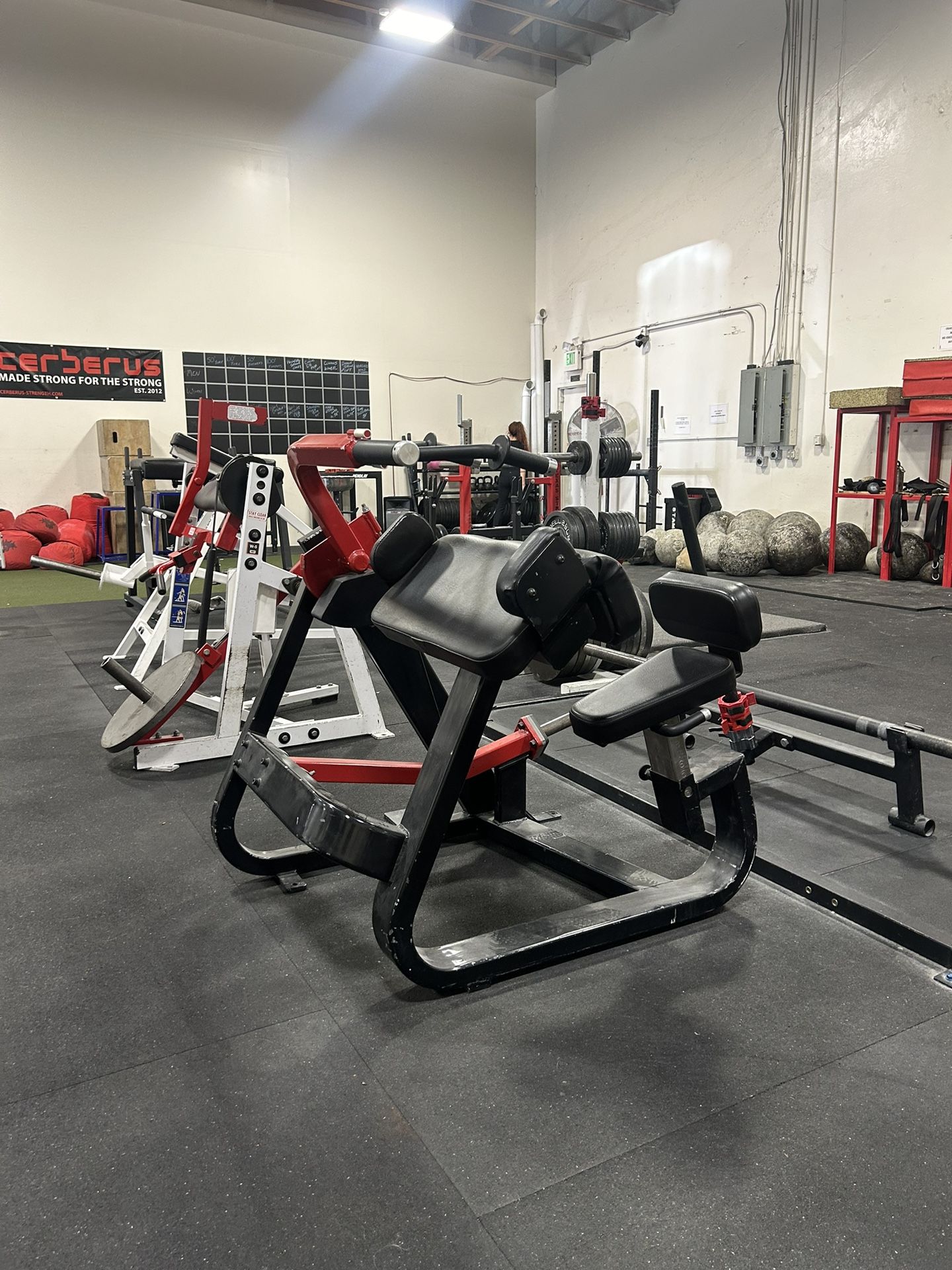 Plate loaded tricep extension machine. Adjustable seat. Recently reupholstered leather
