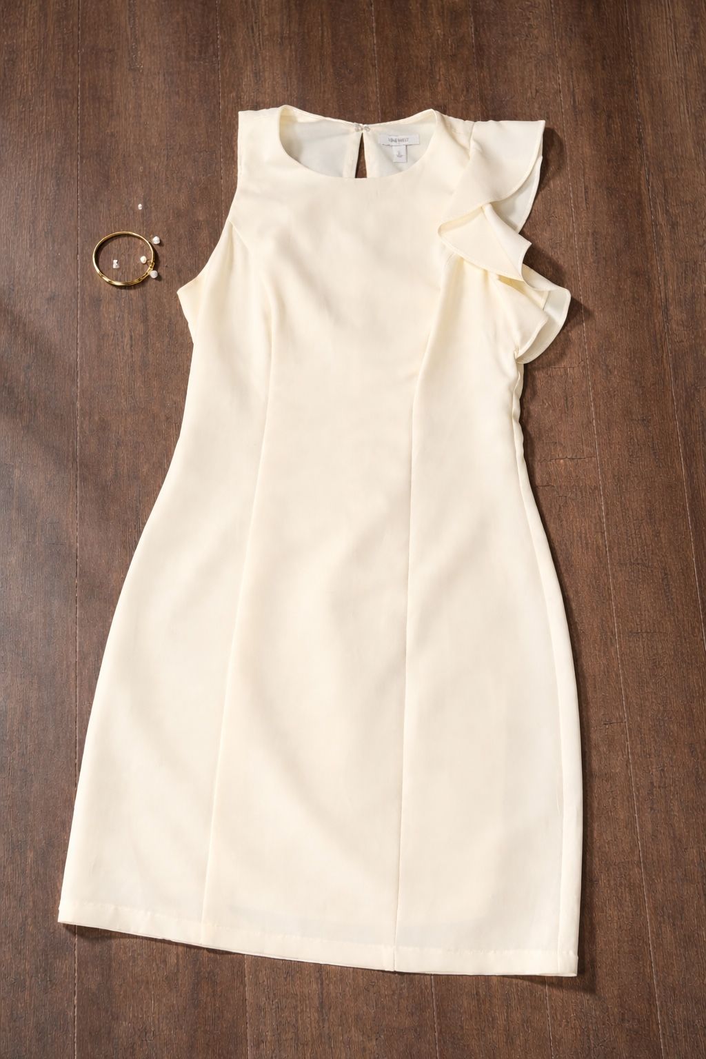 Nine West cream/ivory dress with a ruffle detail on one shoulder. Sleeveless, professional, and super flattering. I wore it once for graduation and it’s in excellent condition with no flaws. Great for graduations, weddings, bridal showers, or any dressy event. Originally $80