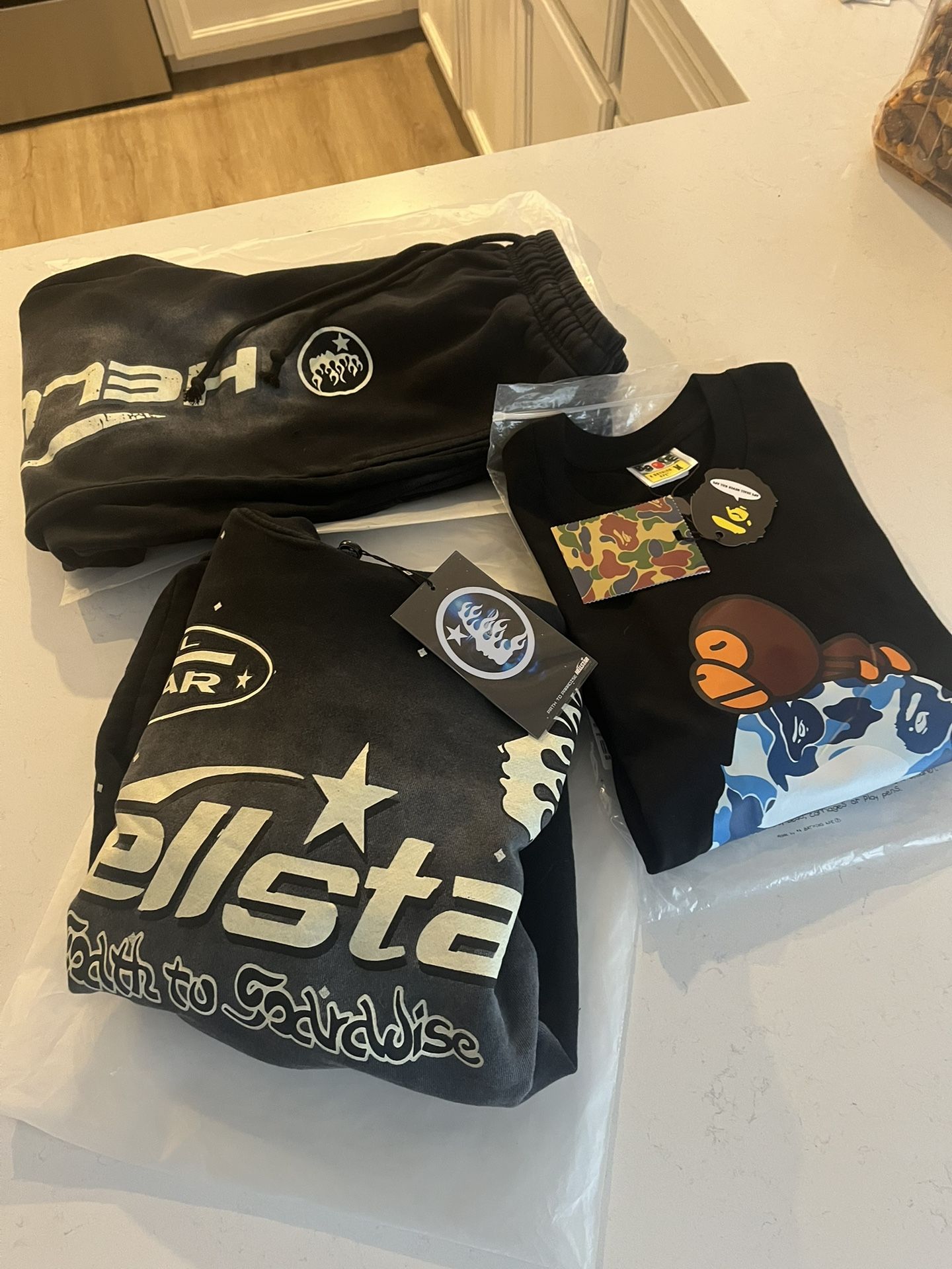 all brand new comes with tags and bag All size medium Hellstar Hoodie - 70 Hellstar Sweats- 70 Bape Tee - 50