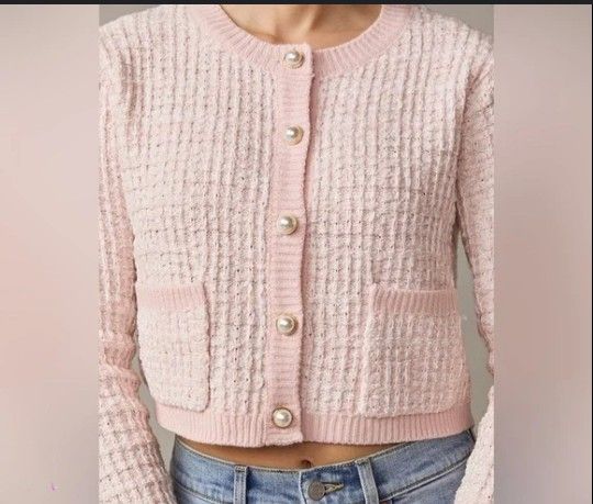 Jessica Simpson Chic pink cardigan with pearl buttons. Features a textured knit and front pockets. Ideal for layering.