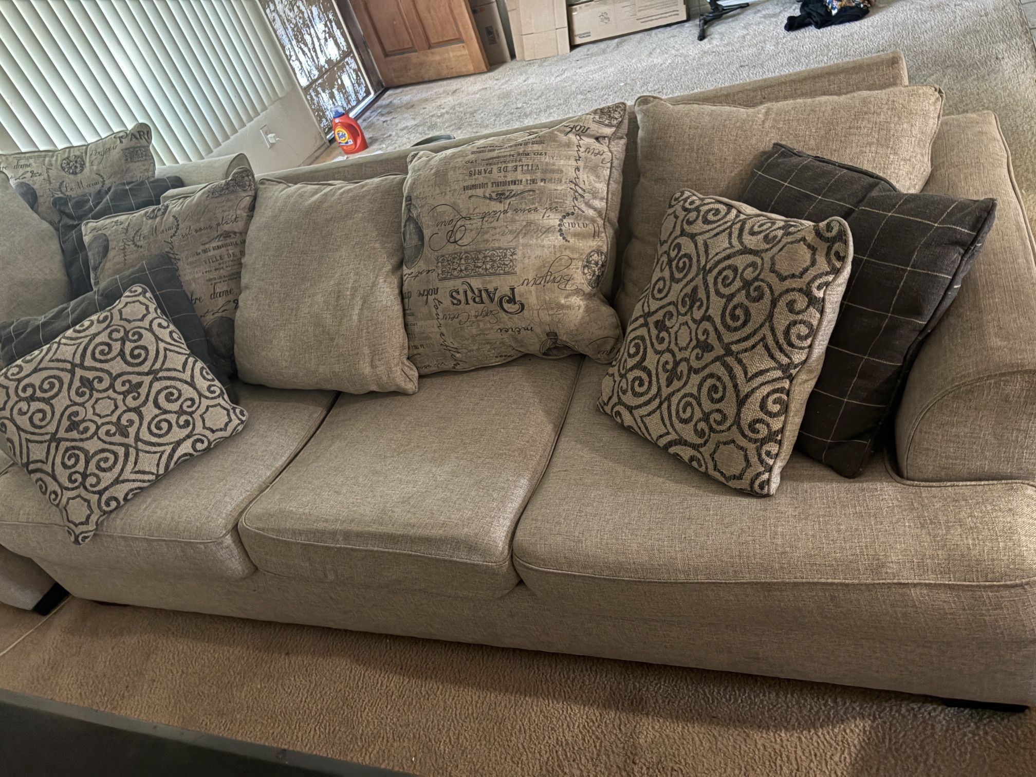 2 piece couch set . 1 couch 1 love seat. Light color Tan. Comes with 6 throw pillow as seen in picture. Pick up only, before Tuesday March 24th. Best offer, first come.