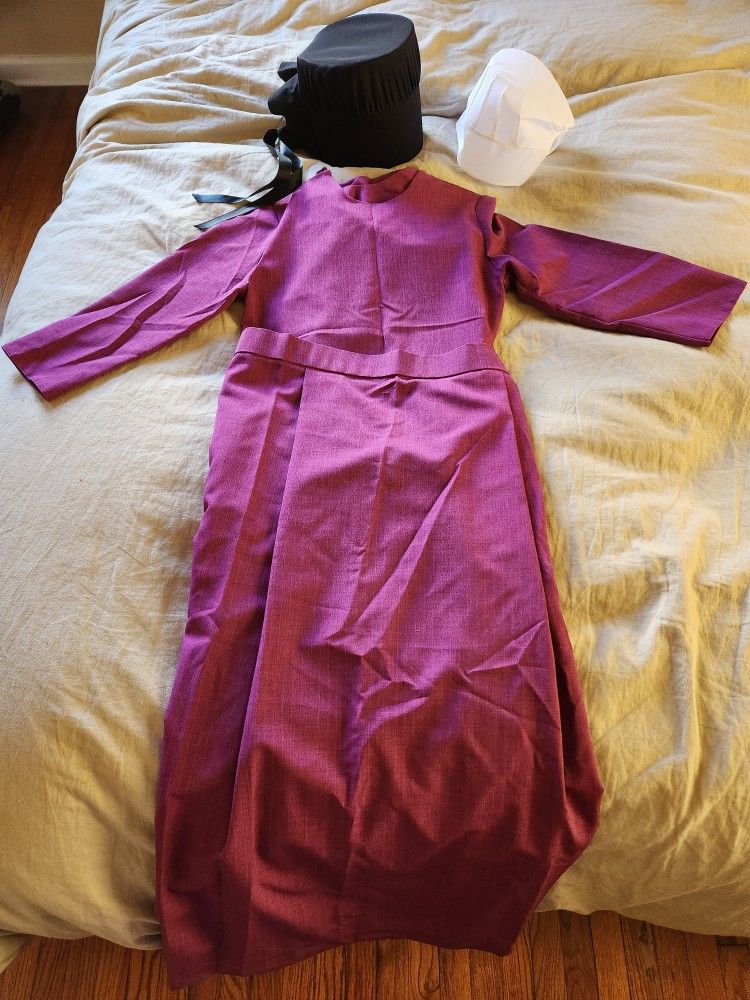 Hand sewn Amish dress. Includes dress, apron, vest, white hair xap, and black dress hat. Approx girls size 10. Doll outfit can be included foran additional $20.
