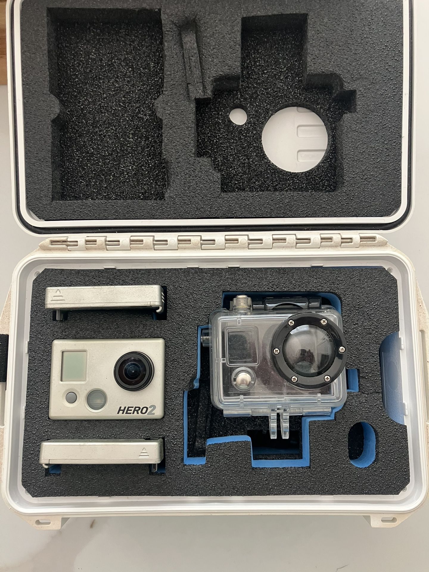 GoPro HD Hero 2 Shoots 1080p video + 11MP photos. Includes waterproof housing, wireless watch remote, external view screen, 2 SD cards, 2 batteries, all necessary cables, and a custom waterproof case (see photos). Works great!