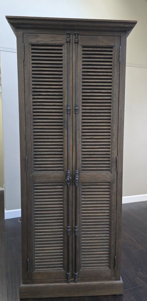 Beautiful Restoration Hardware cabinet / armoire with classic louvered doors and a rich dark wood finish. This is a substantial, architectural piece with clean lines and timeless appeal. Double louvered doors Interior shelving for versatile storage Solid, heavy construction Dark stained wood with crown detail Excellent condition – very clean, no damage Perfect for: Living room or media storage Dining room bar cabinet Bedroom armoire Office or entry storage Dimensions: 91" H x 45.5" W x 22.5" D
