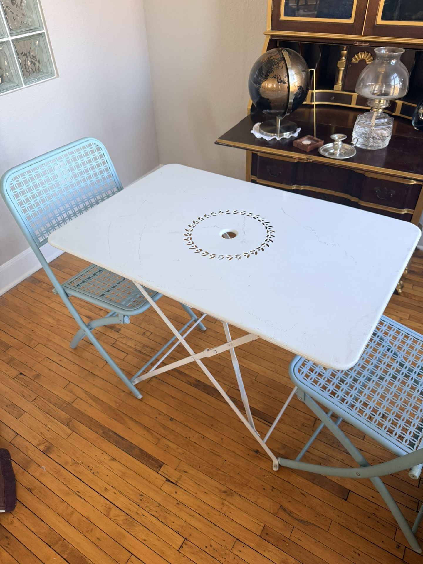 Vintage outdoor patio set, blue enamel. The table is steel, very solid and it has a hole for an umbrella. Fits well on a small/narrow balcony. There is a very small rust spot on the underside of the table, otherwise, everything is in great condition. Pick up in uptown. I can assist in loading.