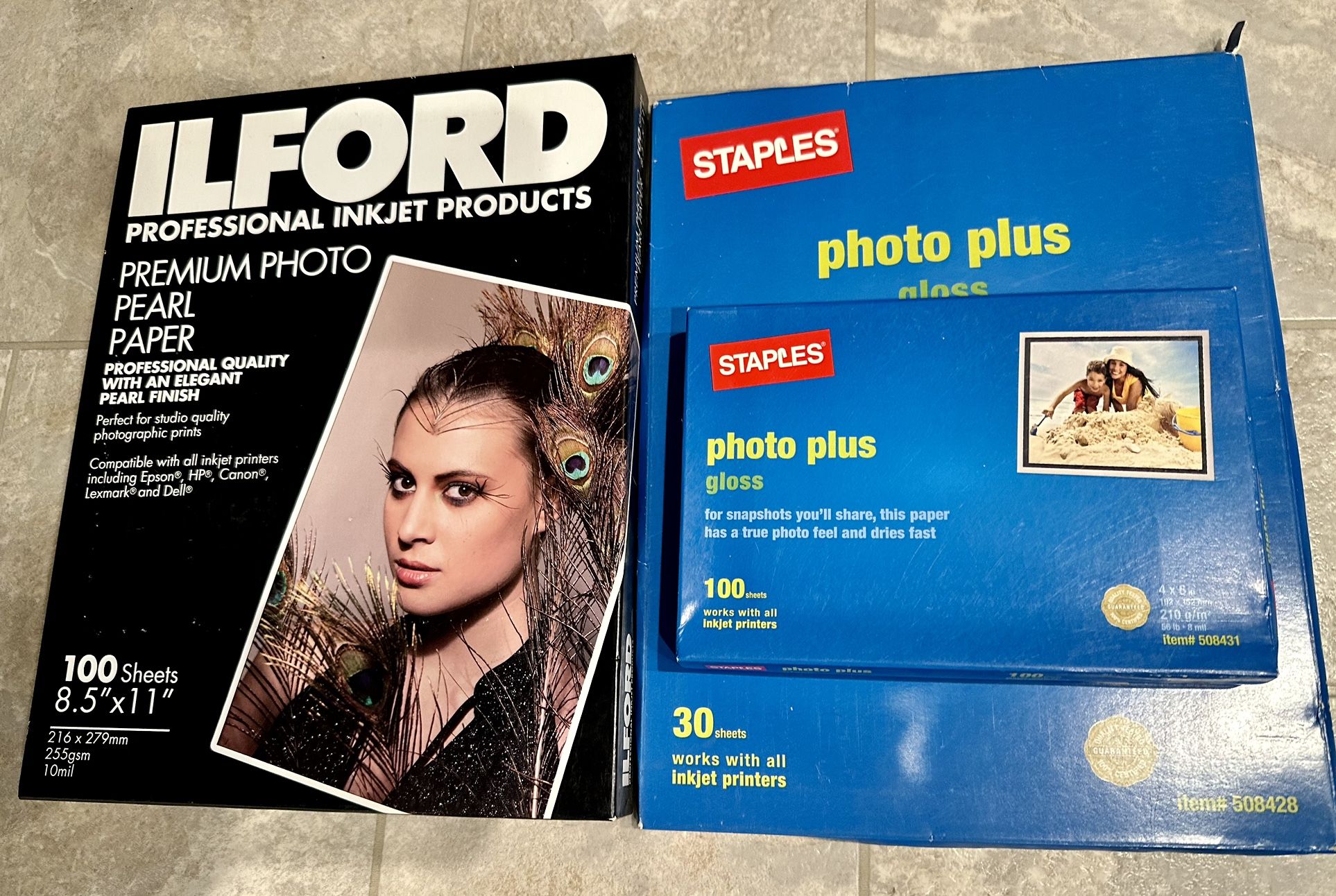 The Staple one box of 8.5 X 11 and two box of 4 X 6 glossy photo plus is New. The Staples Photo paper works with ALL inkjet printers. Includes the Canon, Dell, Epson, and Lexmark printer. This also includes one box of IlFORD professional - 8.5” x 11” - pearl finish paper. The premium paper is 216 x 279mm, by 255gam , by 10mil. Retailed around $70 on Amazon. My lost, your gain. Asking for $30 for ALL 4 boxes FIRM. Pick Up only. Delivery for small fee. Message me if you have any questions. Item is from Non-Smoking house. Thank You for looking. Have a Bless Day.