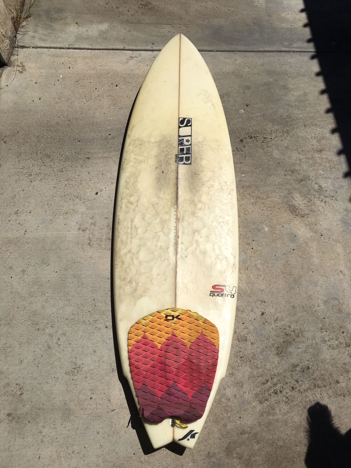 Selling my old Super brand short board. 5 feet 8 inches tall, 19 inches wide,2.25 inches thick, 5-fin set up. Swallow tail and batwing tail rails. Super fun board, but it has a couple nasty dings on the rail. It's just been sitting in my garage for a long time
