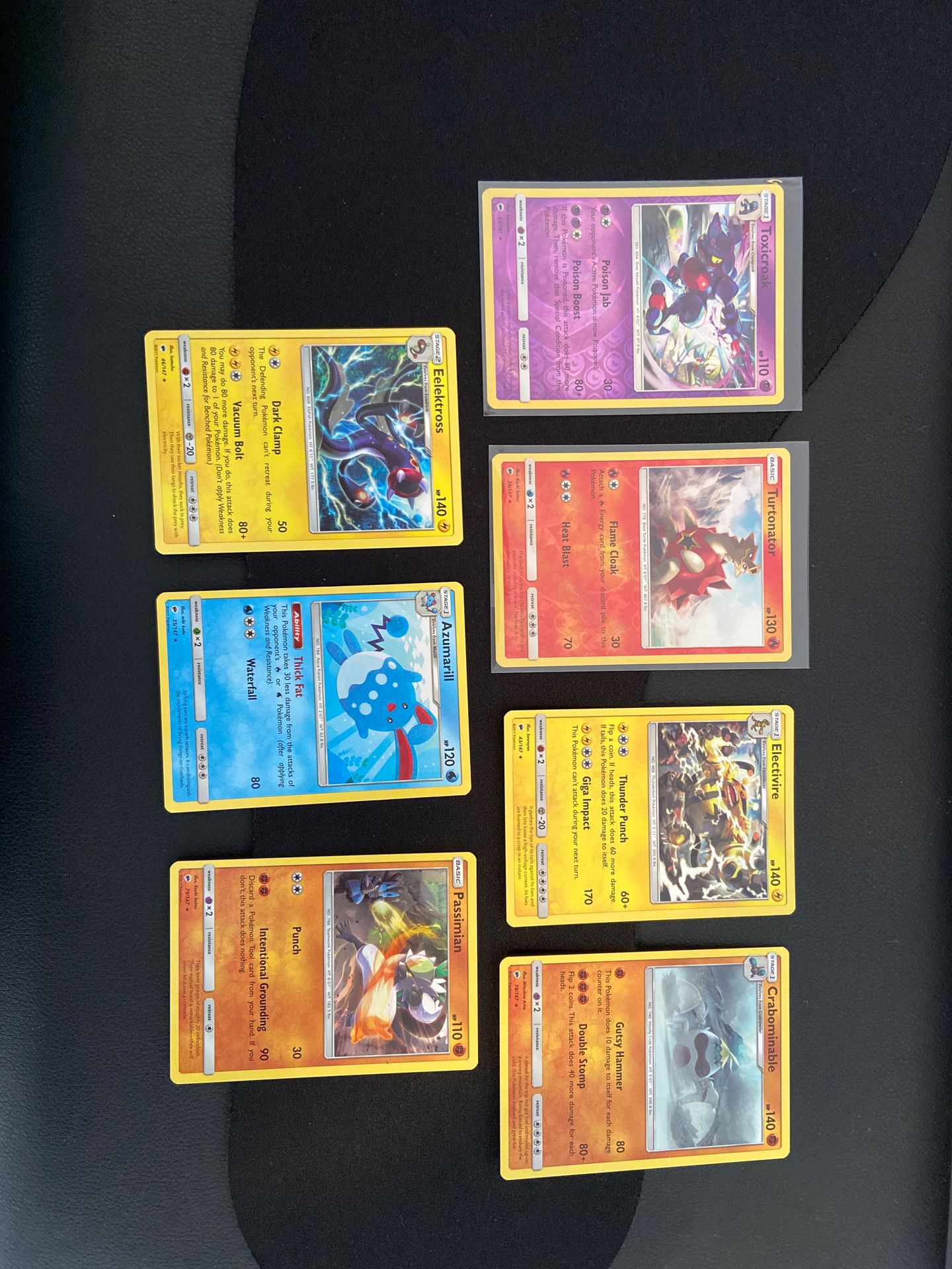 Brand new from Pokémon Burning Shadows. Cards include Toxicroak (reverse holo) Turtonator (reverse holo) Electivire Crabominable Eelektross Azumarill Passimian