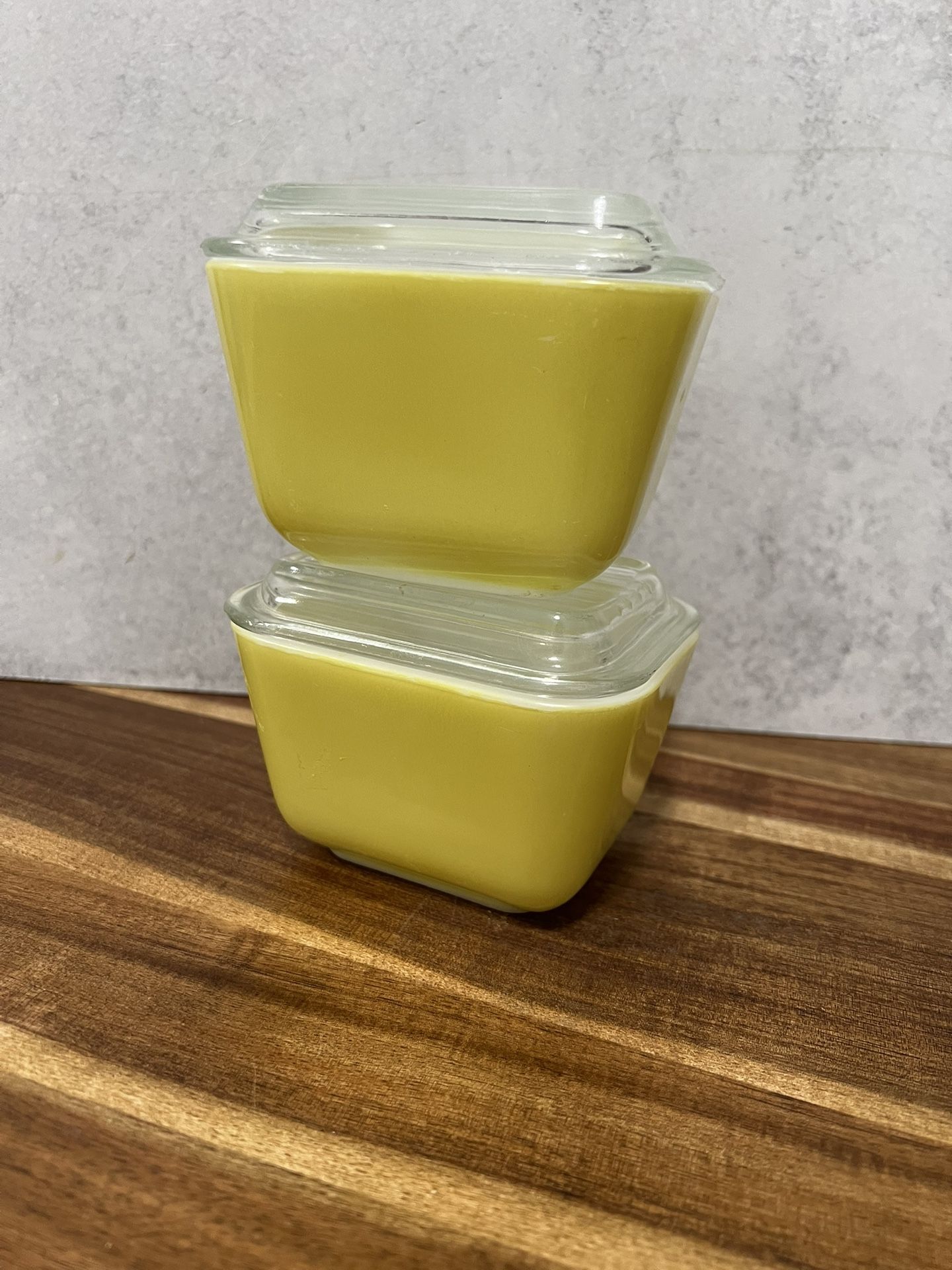 2 Vintage PYREX Yellow Refrigerator Dishes 501B 1-1/2 Cup With Lids