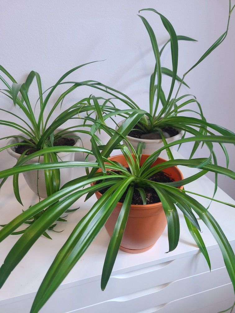 Happy spider plant in organic soil. Freshly potted in 8" pot with drainage stopper and 3 holes to prevent root rot. This plant will thrive in this pot for months or you can repot it as it grows, they will grow to fit the pot tete. Spider plants are really low maintenance and can grow in many different light and temperature conditions so they make great gifts or starter plants! They are also super easy to propogate from the arms they sprout off if you want plant babies or you can let them grow and decorate around the house. The last 3 pictures are photos of some of my more mature spider plants for reference. I also have other sizes available!